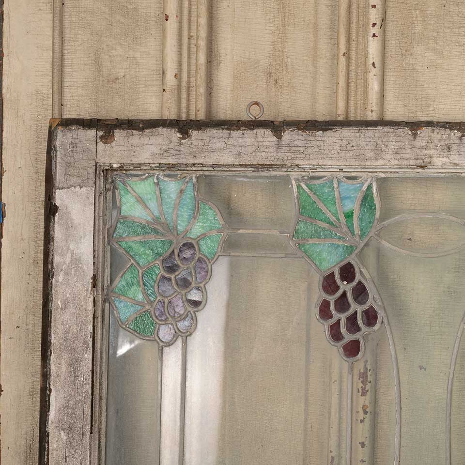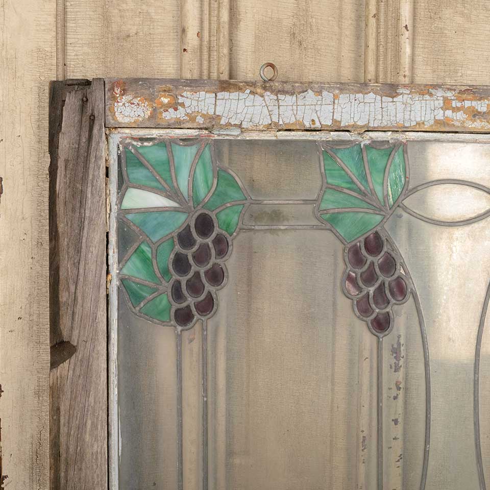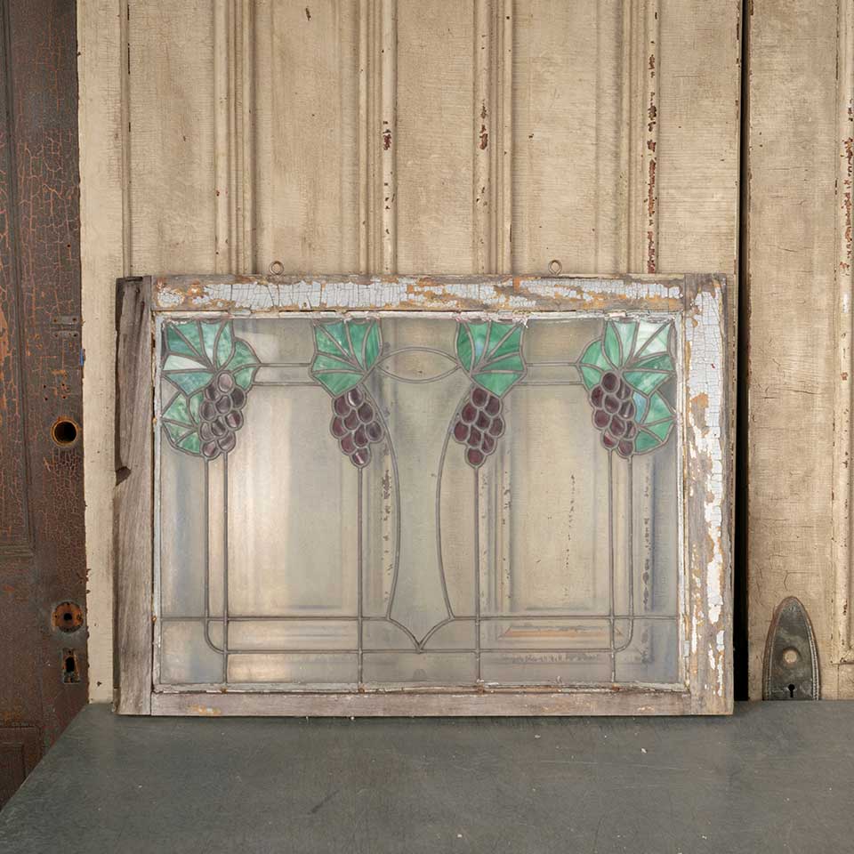 Architectural salvage antique stained glass window with grape motif measuring approx. 32 1/2" wide x 23" tall x 1 1/2" front to back. There's some bowing of the glass and some wood loss on the sash. See photos to evaluate condition.