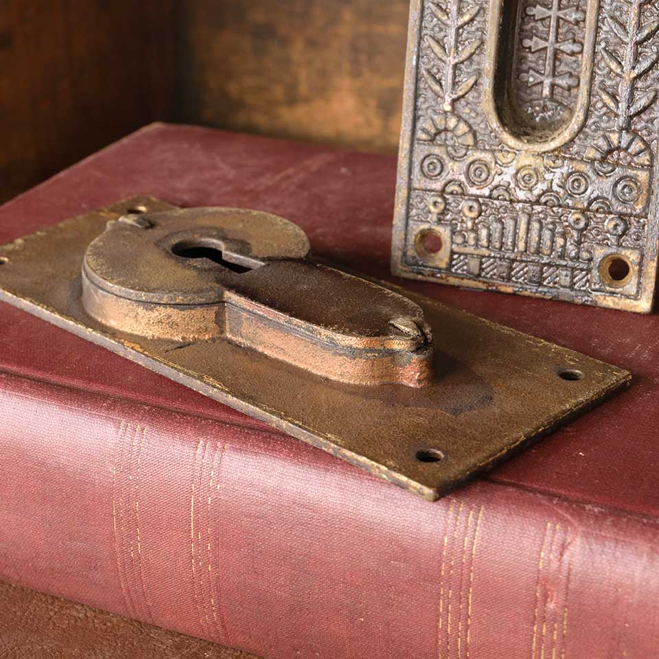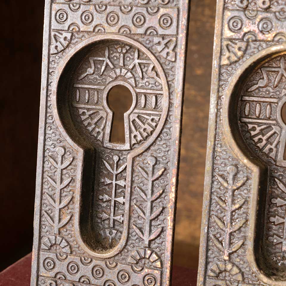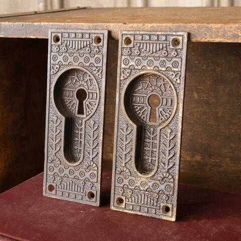 Pair of architectural salvage antique cast iron Reading Windsor pattern (circa 1885) pocket door pull handles hardware with keyholes, each measuring approx. 2 1/8" wide x 5 3/8" tall with a recessed area 1 5/8" wide x 3" tall See photos to evaluate condition. Priced at $195 for the pair.
