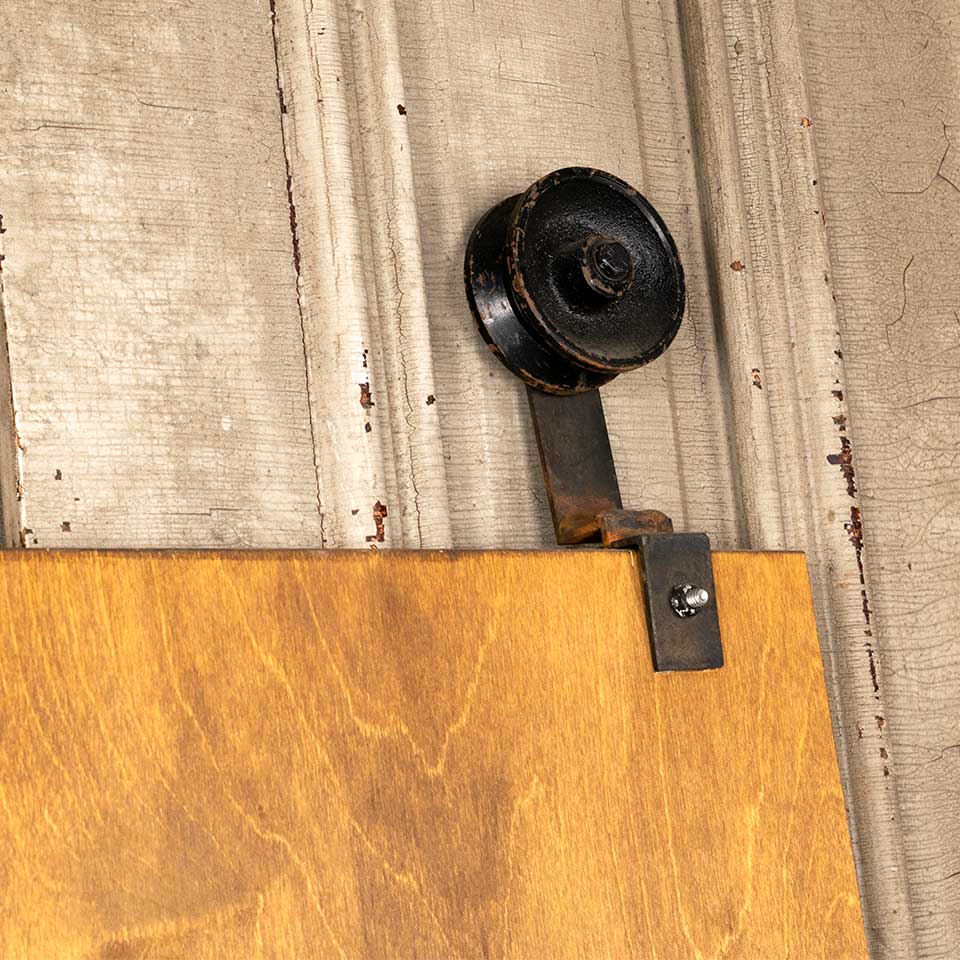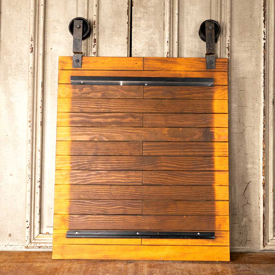 Architectural salvage industrial style wood and metal display board measuring approx. 24" wide x 28" tall (33 1/2" with faux track wheels). See photos to evaluate condition.