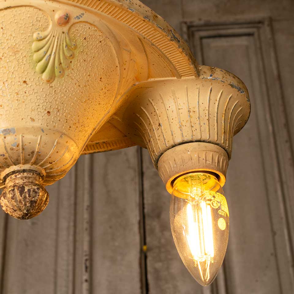 Architectural salvage antique cast metal 2 bulb ceiling light fixture measuring approx. 12 3/8" wide x 6 1/2" front to back with a 3 3/4" drop. See photos to evaluate condition. Salvaged lighting should be inspected by a licensed electrician prior to installation.