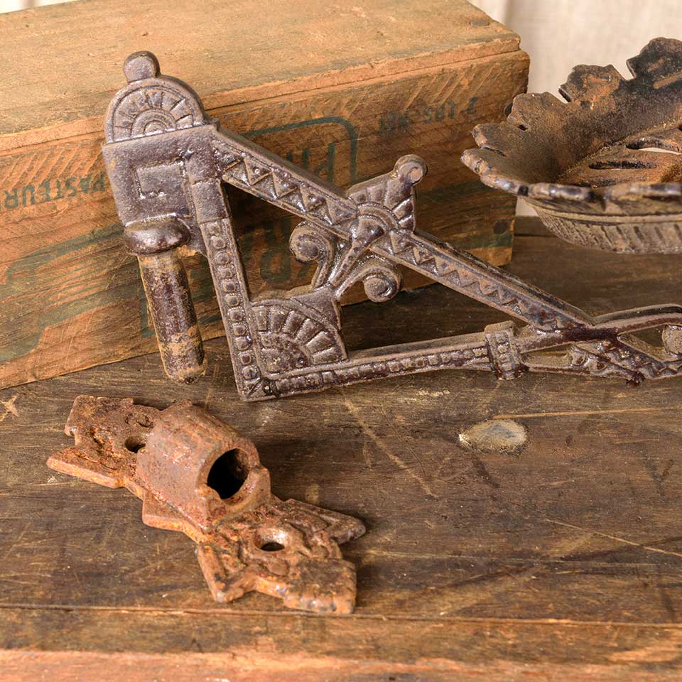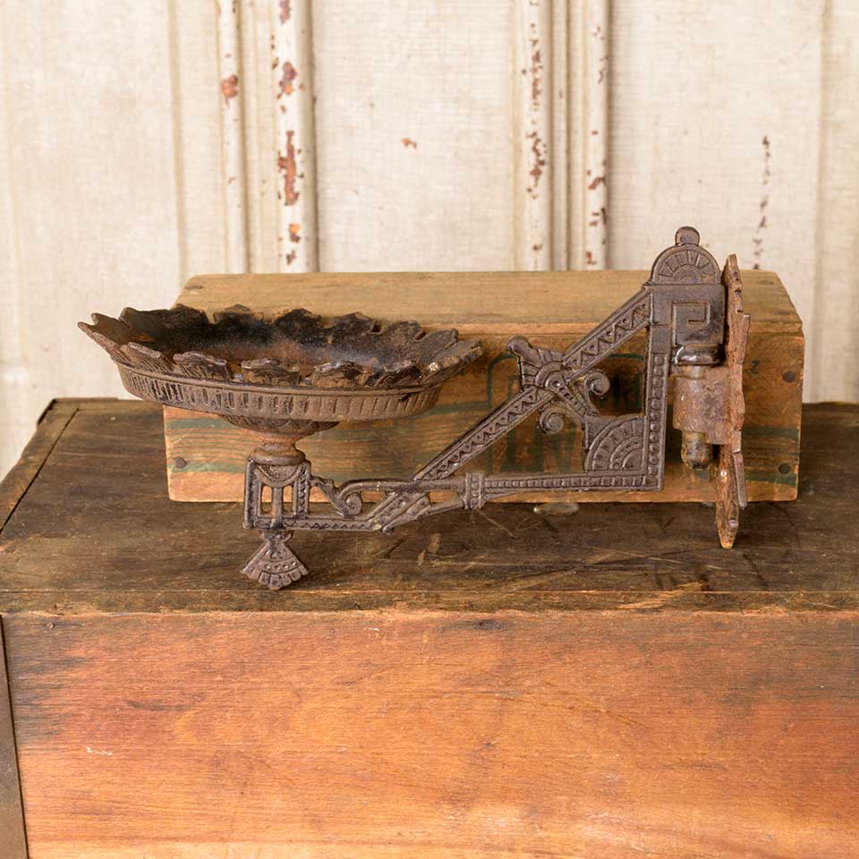 Architectural salvage antique cast iron Victorian Eastlake patterned wall mount oil lamp sconce with wall bracket measuring approx. 5" wide x 4 3/4" tall x 8 5/8" front to back (with bracket). See photos to evaluate condition.