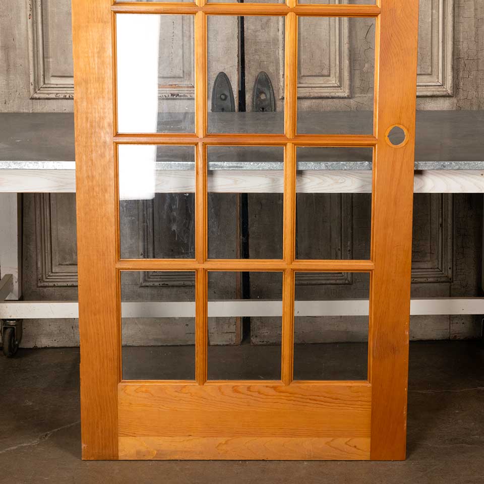 Architectural salvage fifteen lite pine wood interior French door measuring approx. 35 3/4" wide x 79 7/8" tall x 1 3/8" thick. This is not an antique door. See photos to evaluate condition.