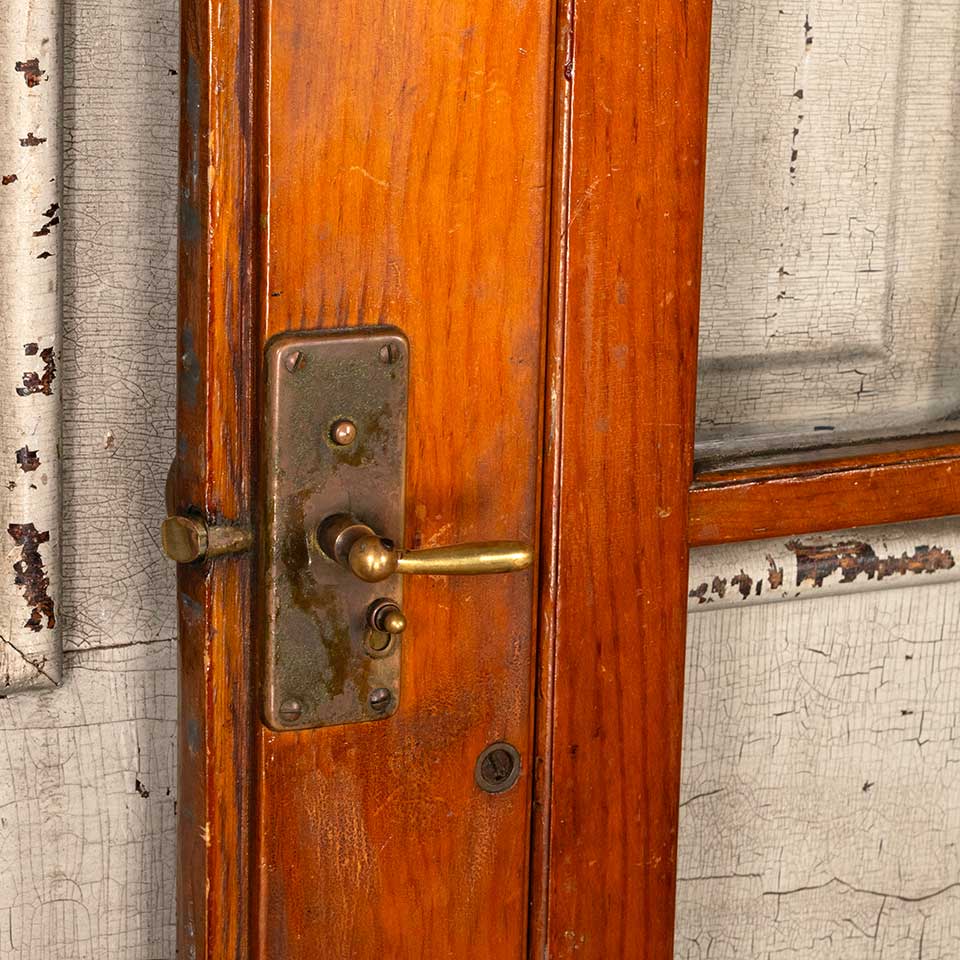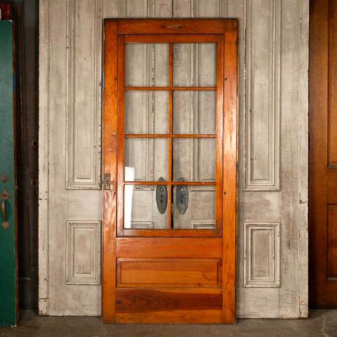 Architectural salvage antique divided nine lite pine wood storm door with handles and latch measuring approx. 35 7/8" wide x 80 7/8" tall x 1 1/8" front to back. See photos to evaluate condition.