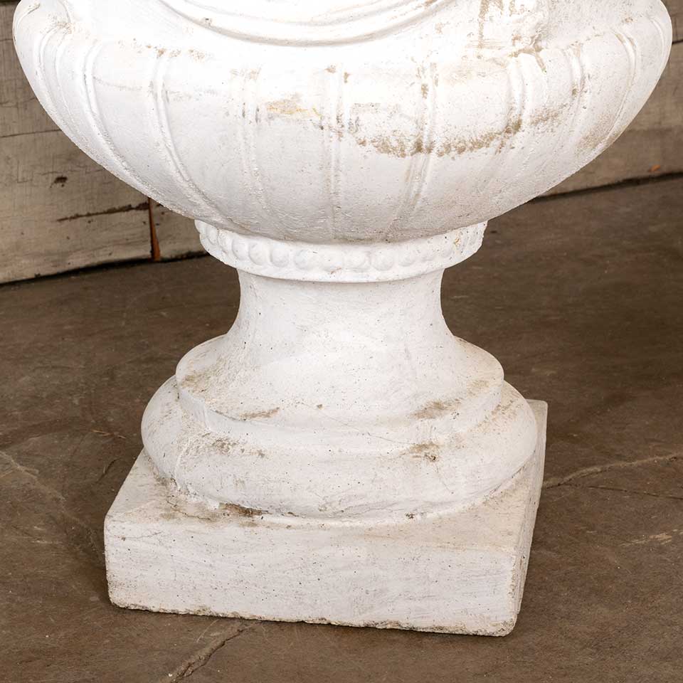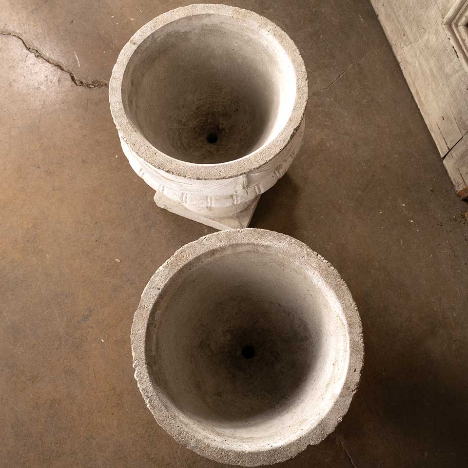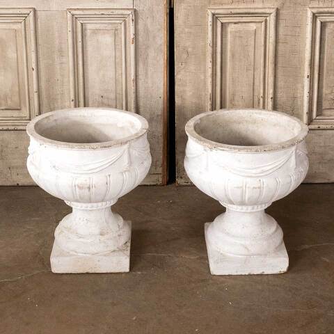 Pair of architectural salvage vintage cast concrete garden urn planters with swag motif each measuring approx. 14 1/2" diameter x 16 1/2" tall with a 9" x 9" square base. See photos to evaluate condition. Priced at $525 for the pair.
