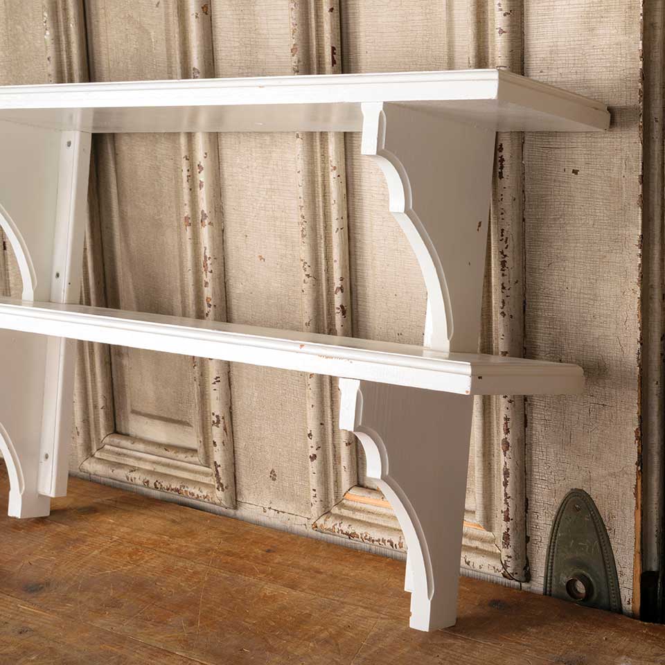 Painted wood two tier wall mount display shelf measuring approx. 30" wide x 17" tall x 6" front to back. This is not an antique. See photos to evaluate condition.