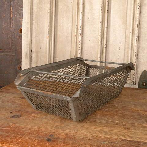 Architectural salvage industrial metal basket with handles measuring approx. 22 1/2" wide x 7 1/4" tall x 12 1/4" front to back. See photos to evaluate condition.