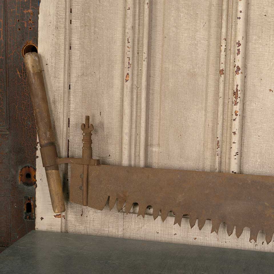 Antique large two man lumberjack crosscut "misery whip" wood saw measuring approx. 74 1/2" long x 15" tall x 1 1/4" wide. See photos to evaluate condition.