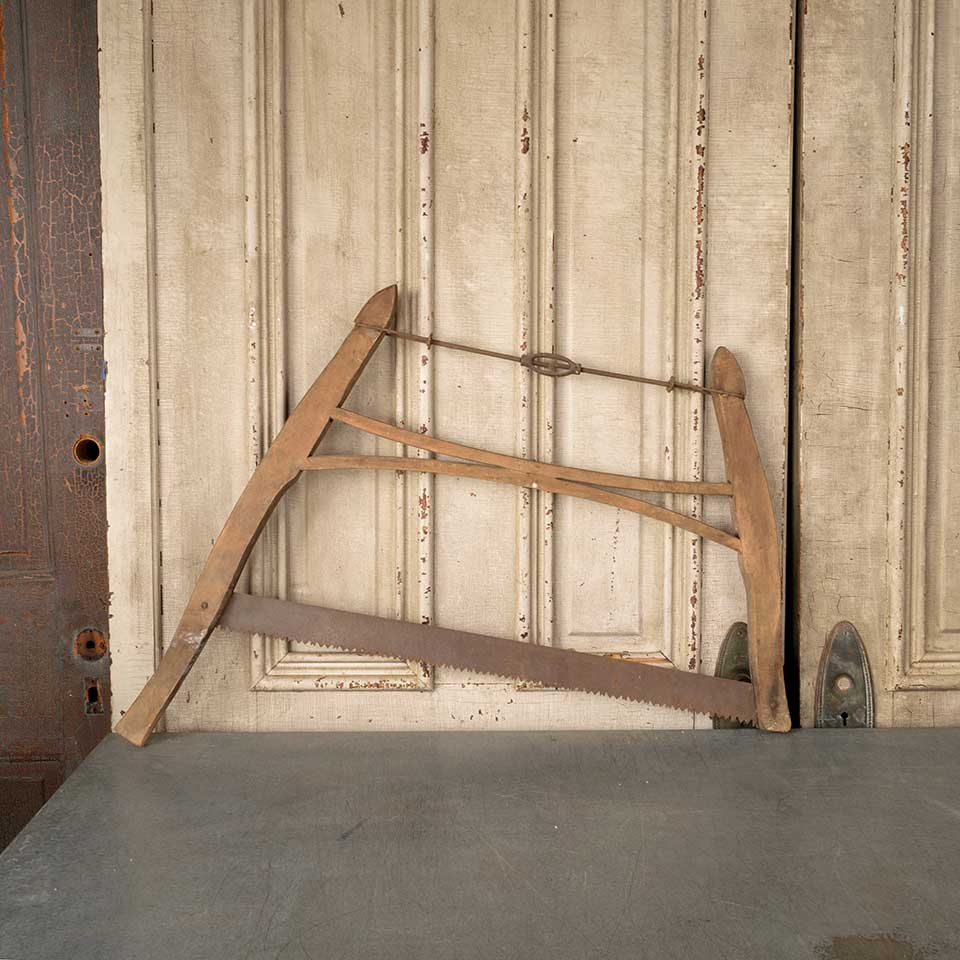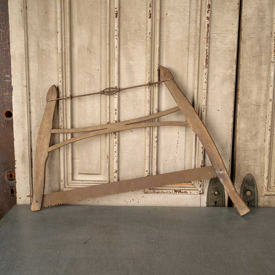 Antique primitive oak buck bow wood cutting handsaw measuring approx. 34 1/4" long x 25 1/4" tall x 1" thick. See photos to evaluate condition.