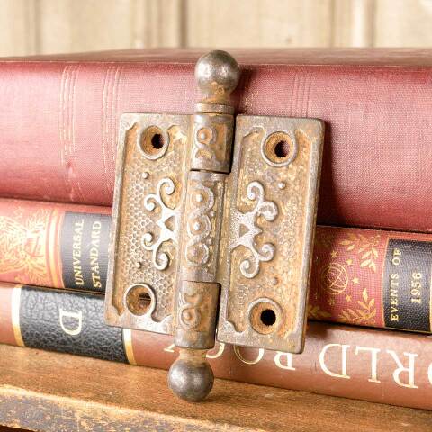 Architectural salvage antique ornate cast iron door hinge hardware with ball finials measuring approx. 2 1/2" x 2 1/2" (3 7/8" tall including finials). See photos to evaluate condition.