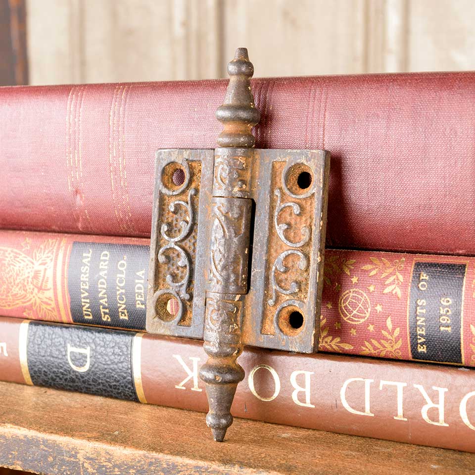 Architectural salvage antique ornate cast iron door hinge hardware with steeple finials measuring approx. 2" x 2" (4" tall including finials). See photos to evaluate condition.