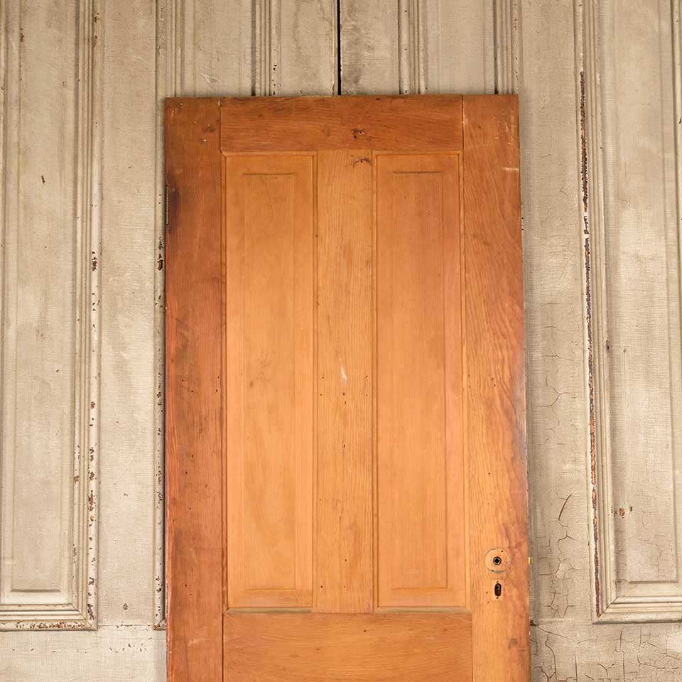 Architectural salvage antique pine wood four panel interior door with mortise lock measuring approx. 27 3/4" wide x 76 3/8" tall x 1 3/8" thick. See photos to evaluate condition.