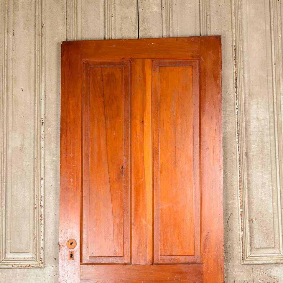 Architectural salvage antique pine wood four panel interior door with mortise lock measuring approx. 31 3/4" wide x 79 3/4" tall x 1 3/8" thick. One of the upper panels has a vertical crack. See photos to evaluate condition.