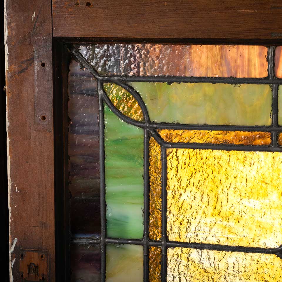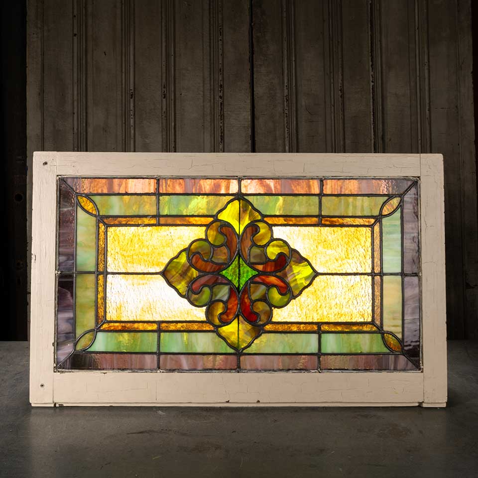 Architectural salvage antique stained glass window measuring approx. 34" wide x 21" tall x 1 3/8" front to back. There are some cracks, but no glass loss. See photos to evaluate condition.