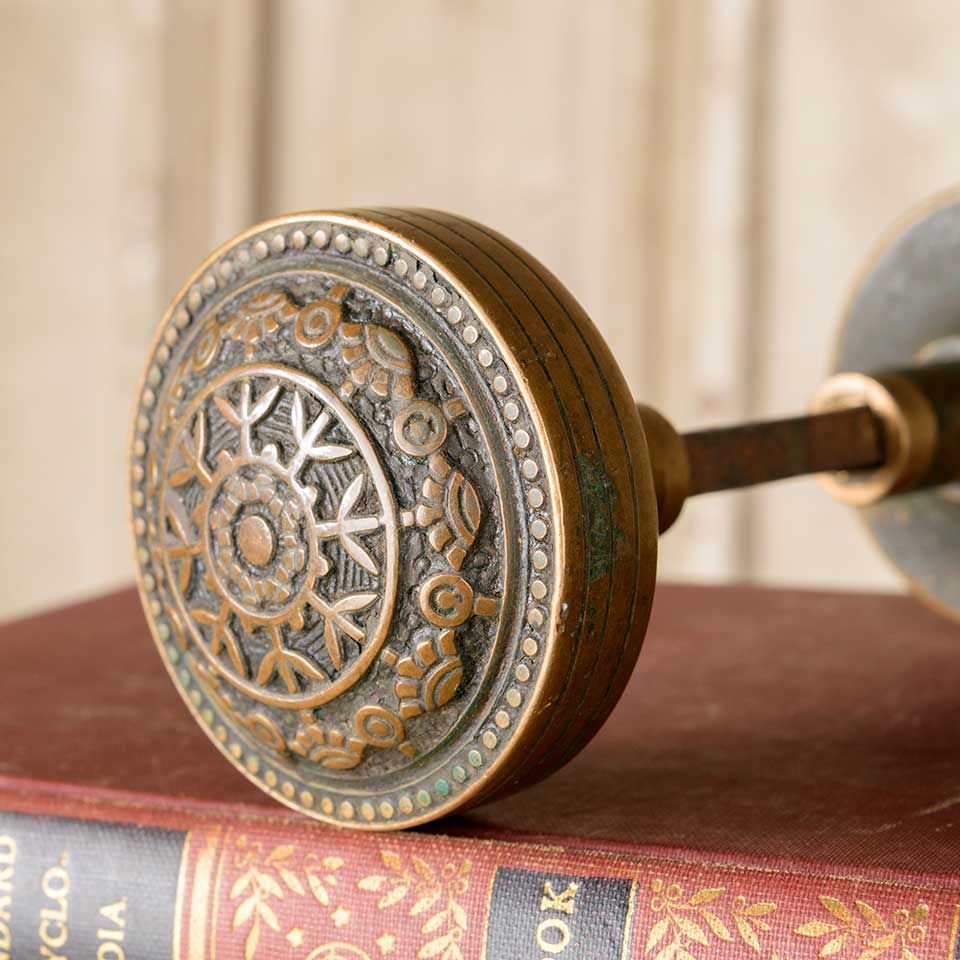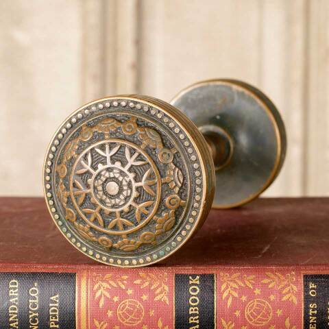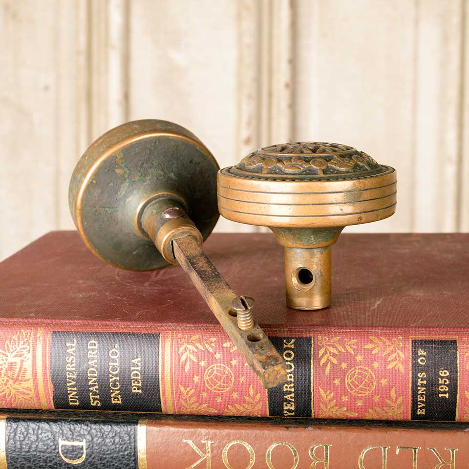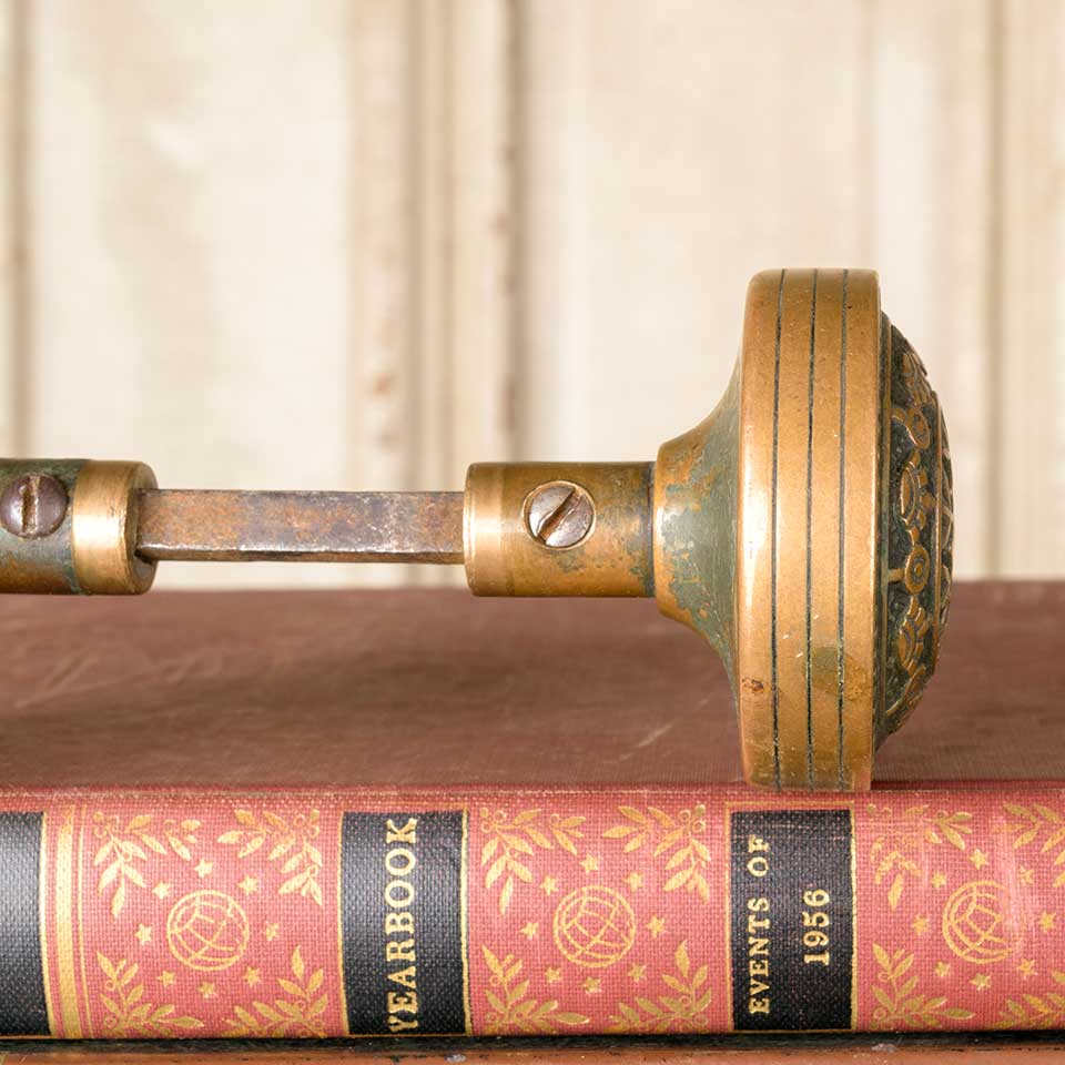 Pair of architectural salvage Victorian antique brass Reading Hardware Company Windsor pattern (c. 1885) doorknobs door hardware each measuring approx. 2 1/4" in diameter with a 5/8" diameter stem. Pair includes a tapped spindle with set screws. See photos to evaluate condition. Priced at $195 for the pair.