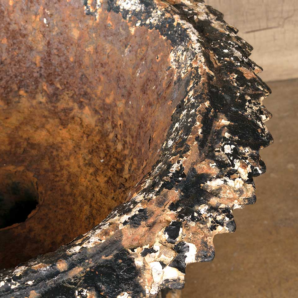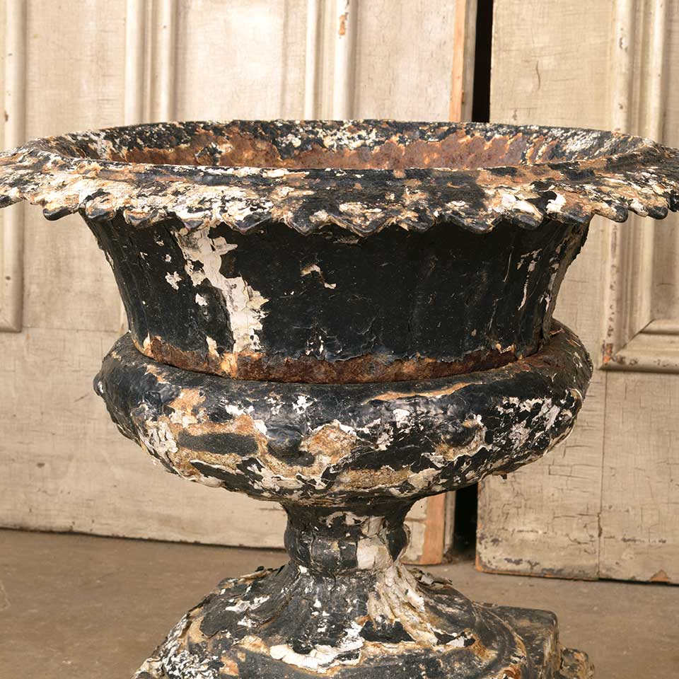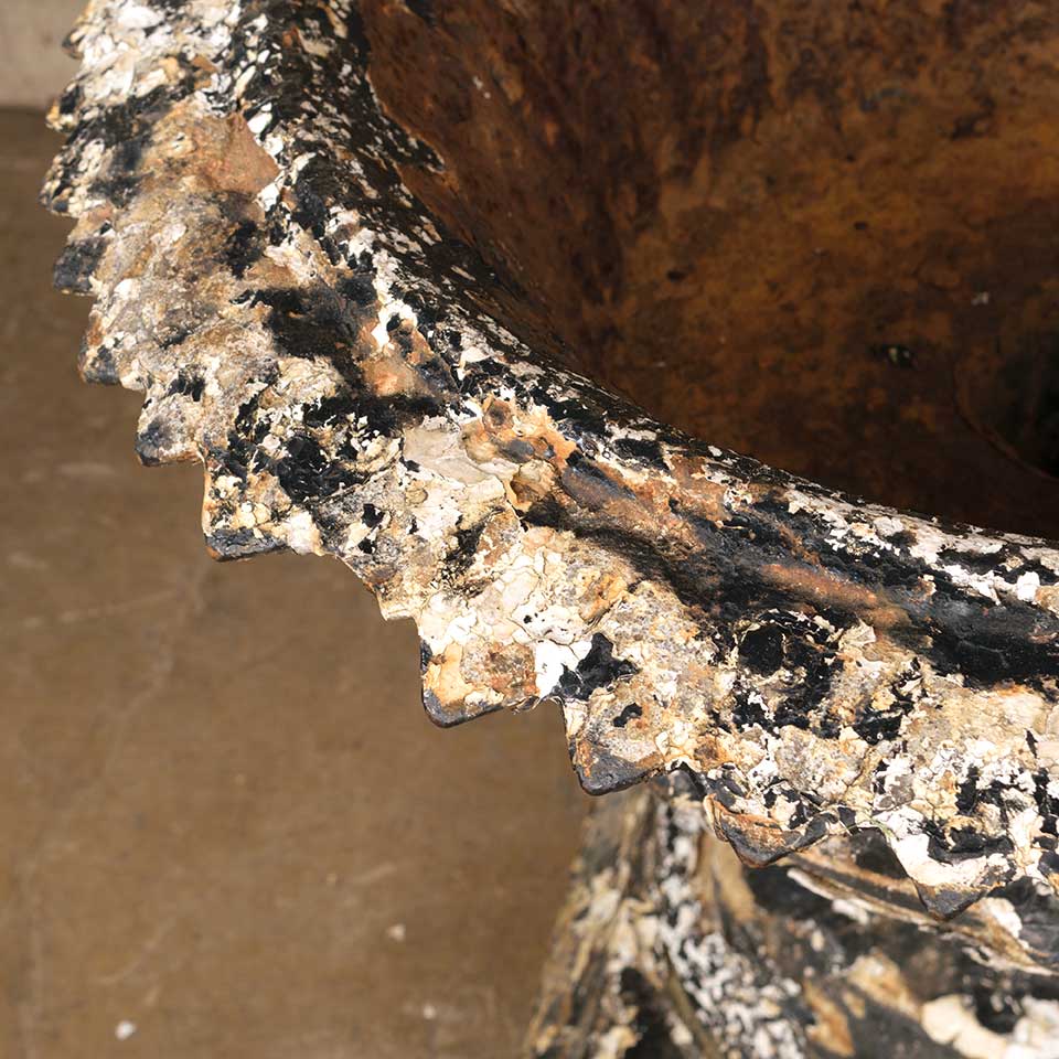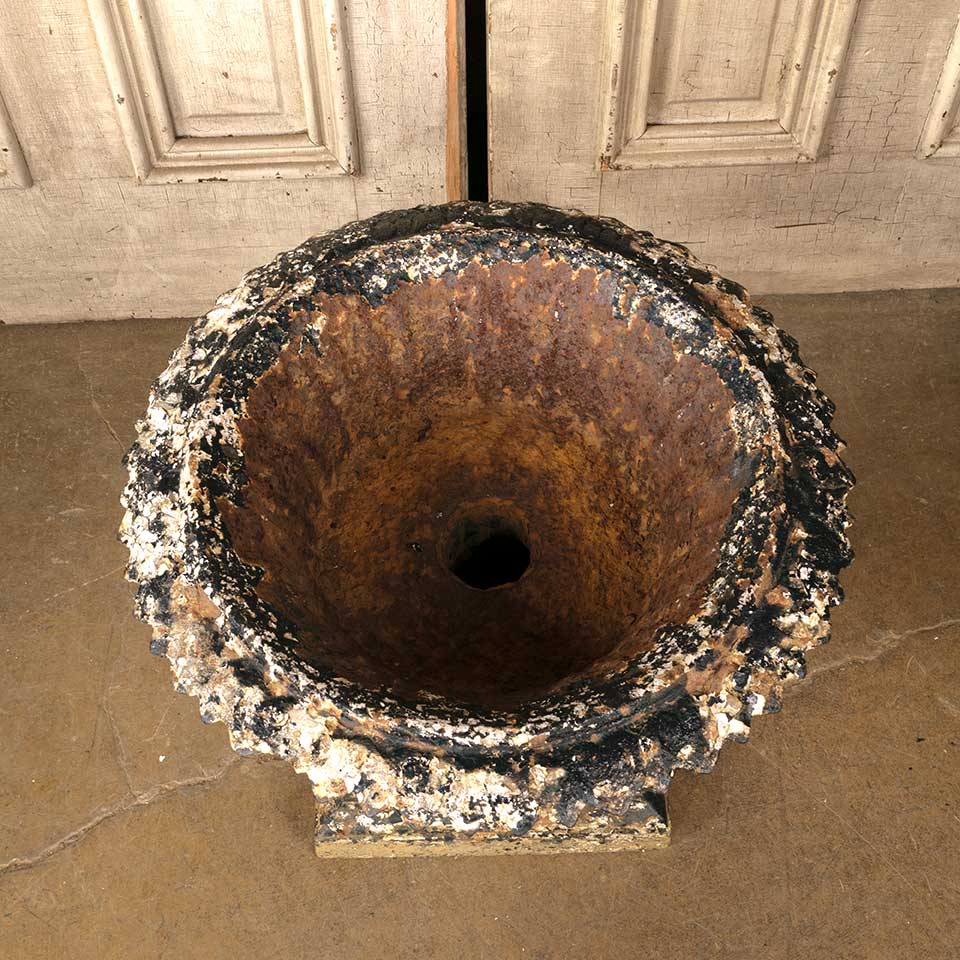 Architectural salvage antique four piece cast iron garden urn planter measuring approx. 21" diameter x 19 1/2" tall with a 13 1/2" x 13 1/2" base. See photos to evaluate condition.