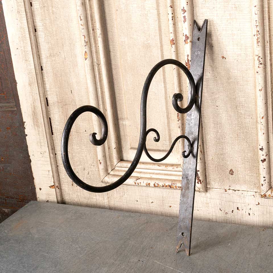 Wrought iron wall mount plant hanger measuring approx. 1 1/8" wide x 16" tall x 11 1/2" front to back. Color and condition may vary.