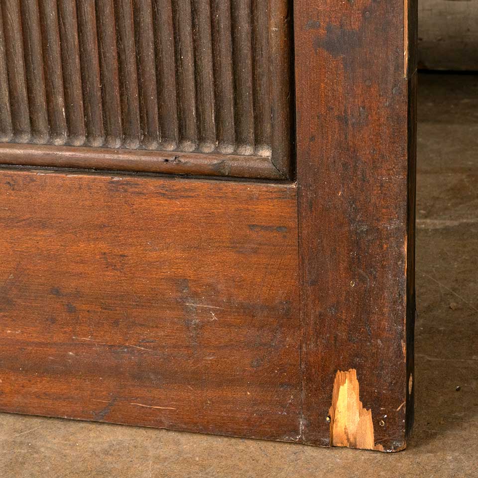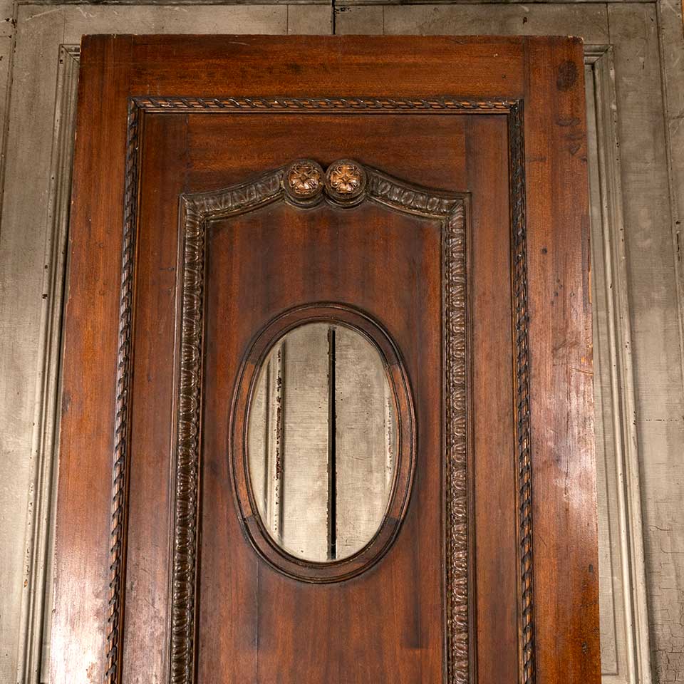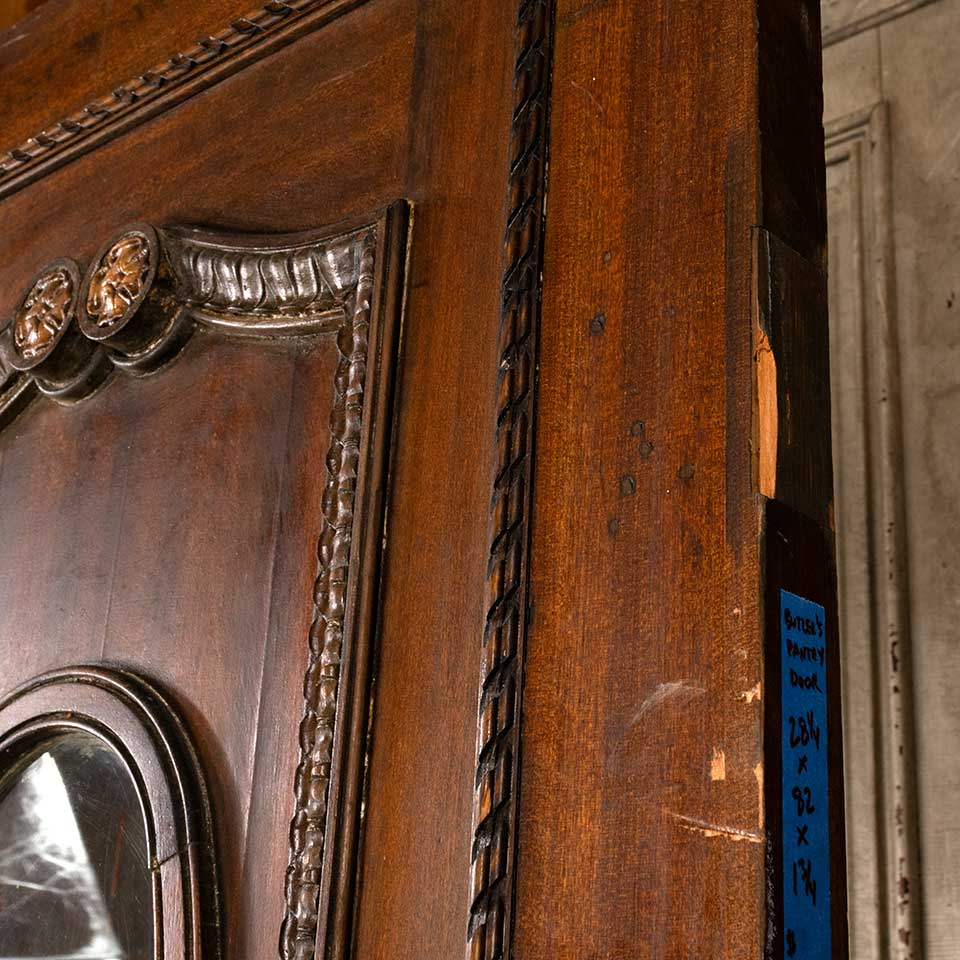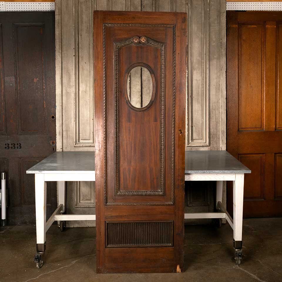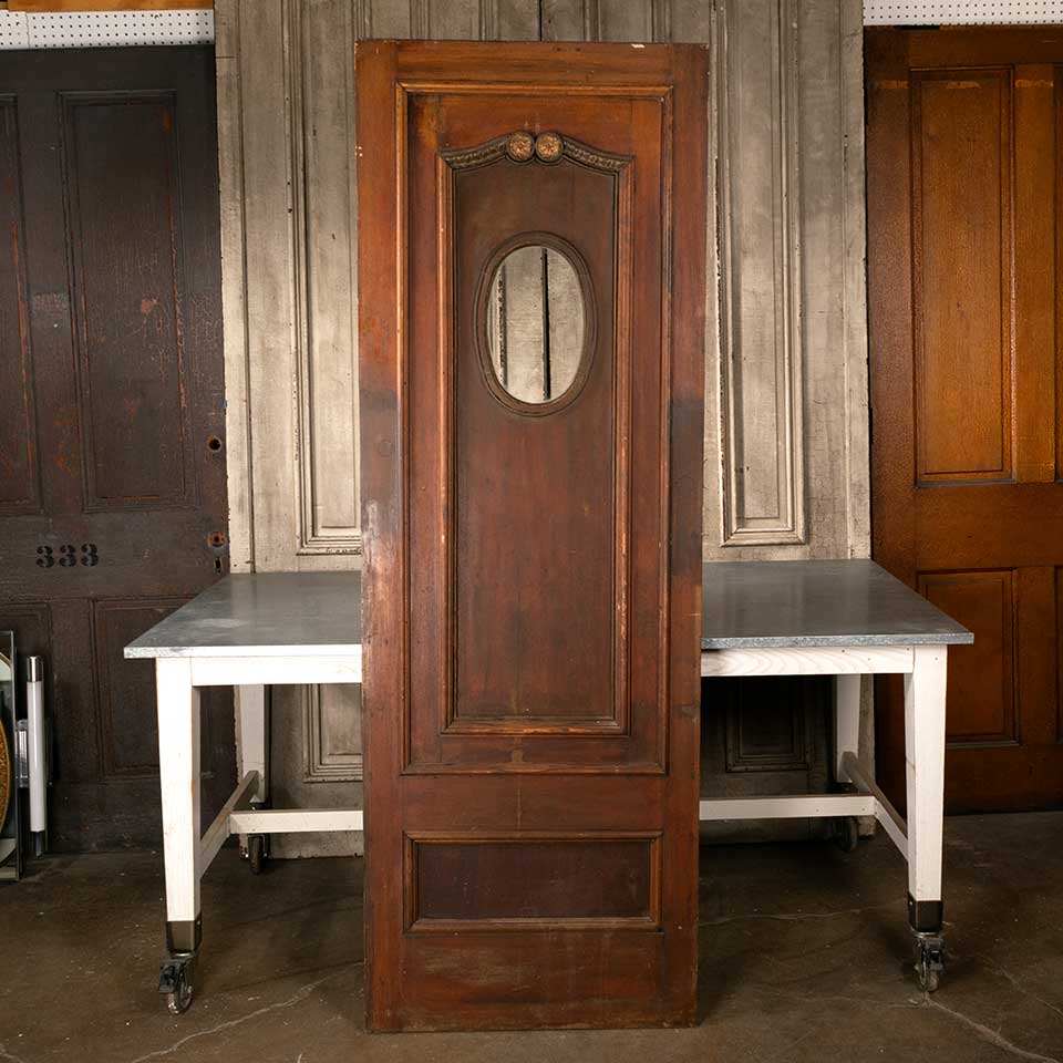 Architectural salvage antique wood butler's pantry door with oval window measuring approx. 28 1/4" wide x 82" tall x 1 3/4" thick. It appears that the swing of the door was changed at some point in its history and there's some wood loss at bottom of door. See photos to evaluate condition.