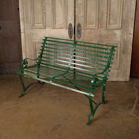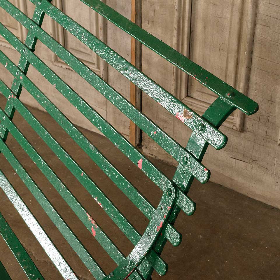 Architectural salvage antique painted metal slat wrought iron garden patio park bench measuring approx. 47 1/2" wide x 30 1/2" tall x 28" front to back. See photos to evaluate condition.