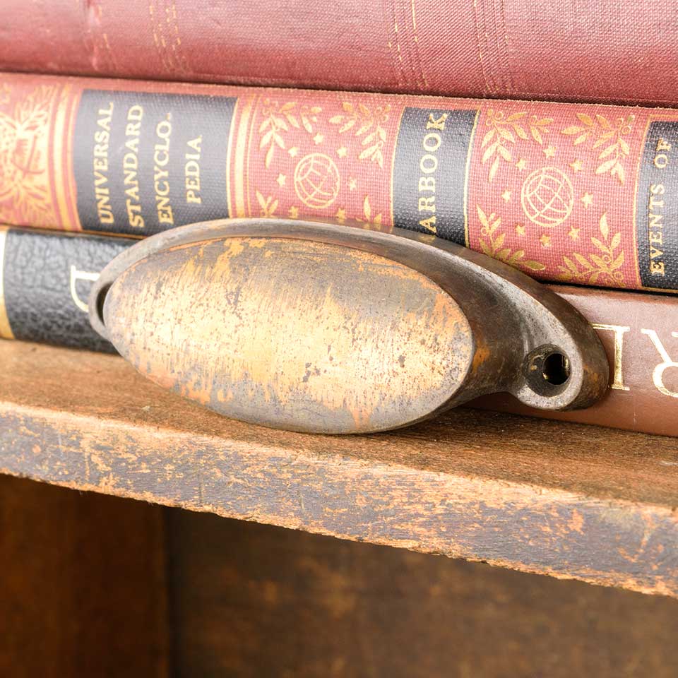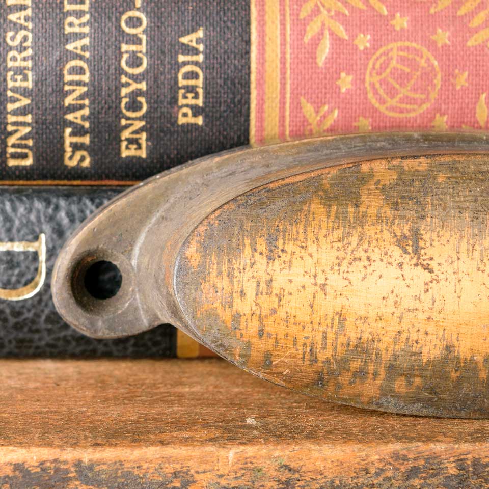 Architectural salvage antique cast iron drawer bin pull handle furniture hardware with a worn bronze finish measuring approx. 3 3/4" wide x 1 3/8" tall x 3/4" front to back with mounting holes 3" on center. Color and condition may vary.