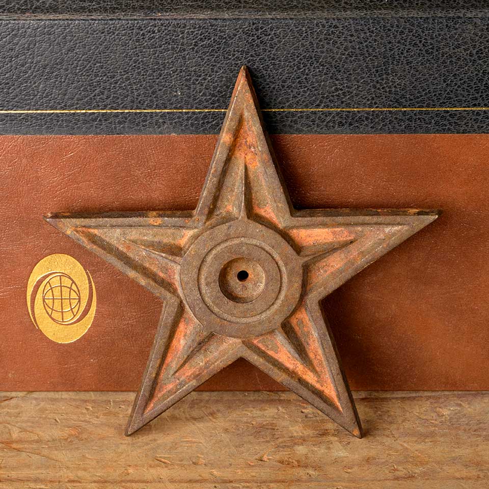 Architectural salvage cast iron exterior building anchor star measuring approx. 6 3/4" in diameter x 1/4" thick. See photos to evaluate condition.