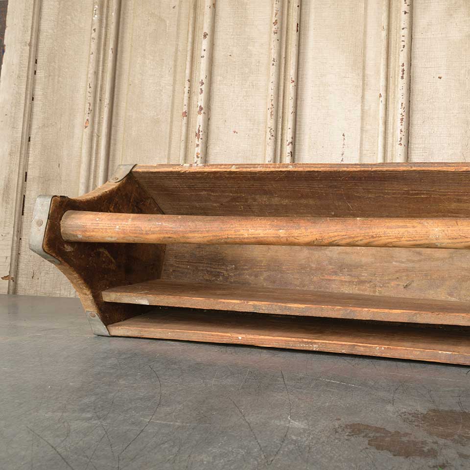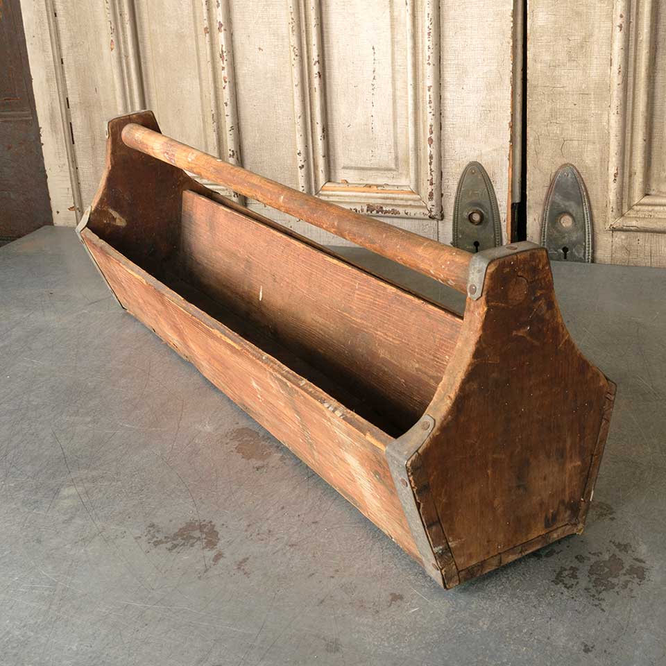 Long antique wood caddy tote toolbox measuring approx. 31 5/8" long x 10 5/8" tall x 8 1/2" front to back. See photos to evaluate condition.
