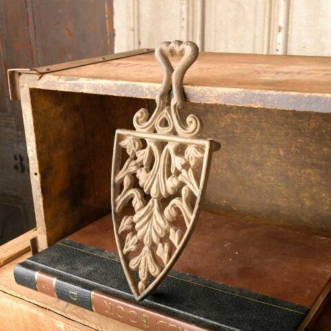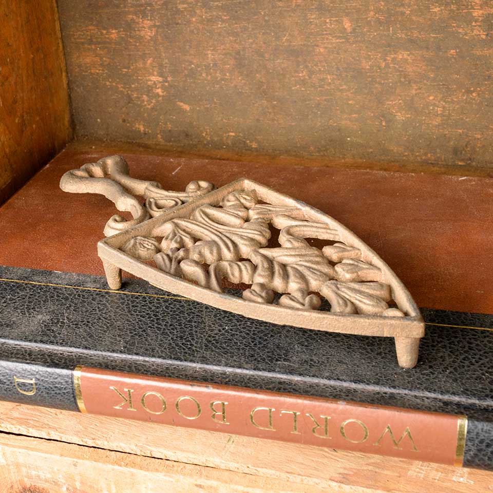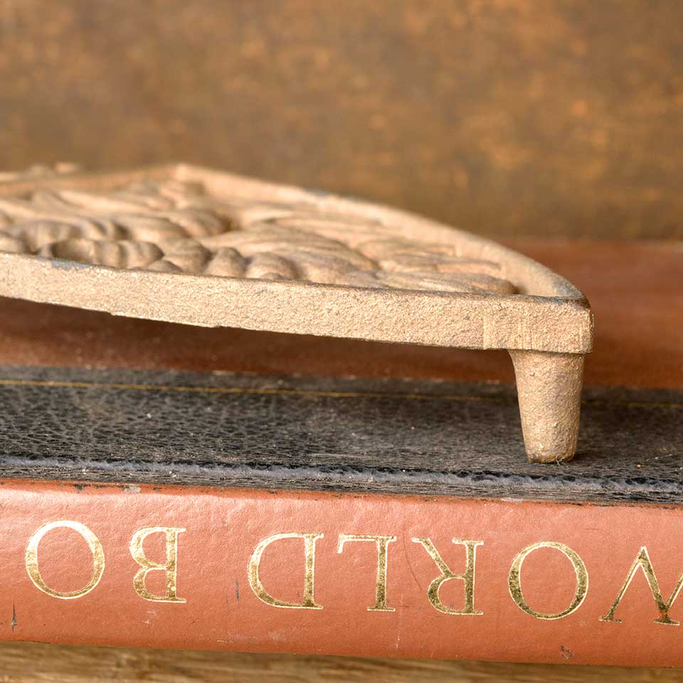 Antique cast brass sad iron trivet measuring approx. 3 3/8" wide x 7/8" tall x 8" long. See photos to evaluate condition.