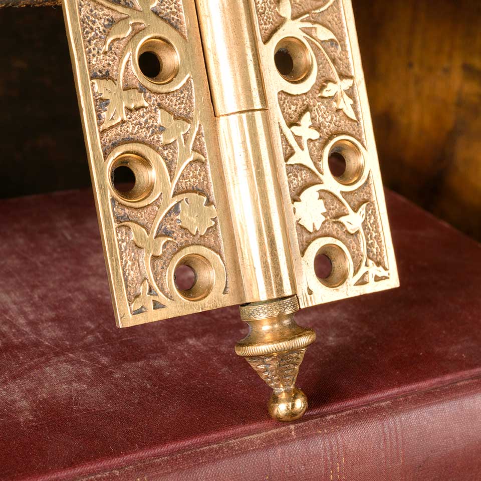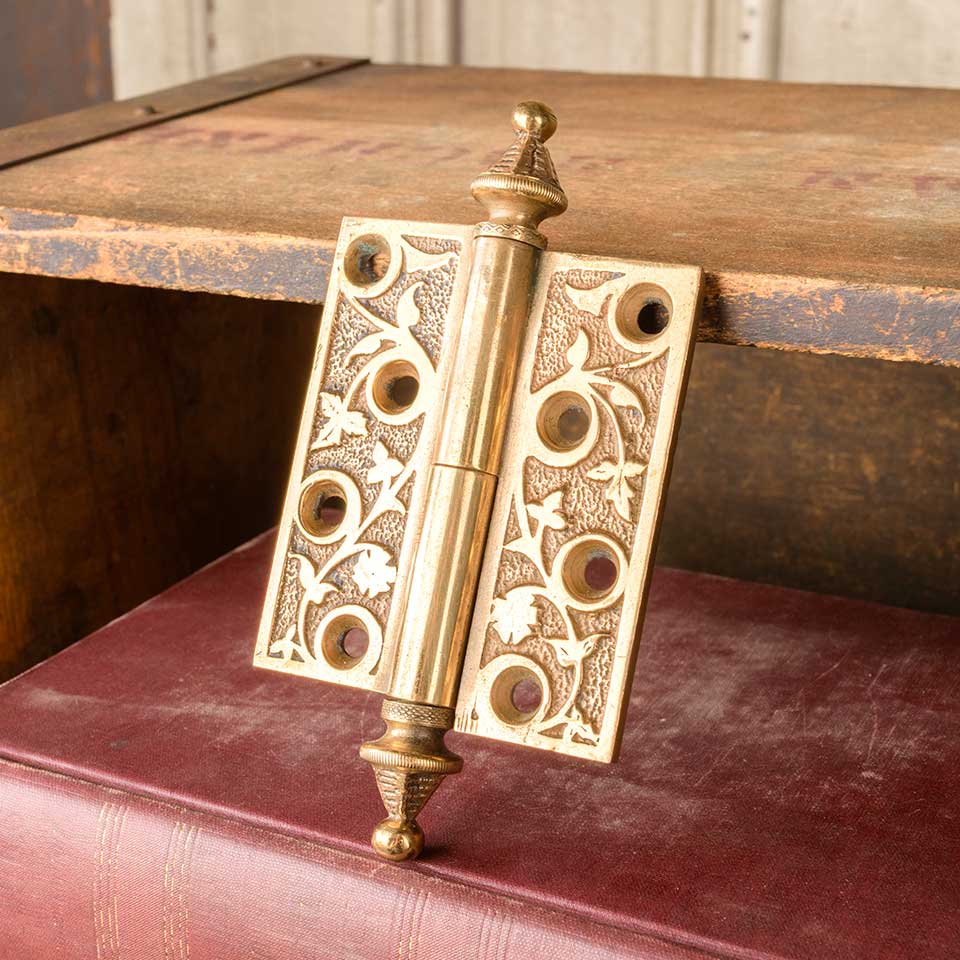 Architectural salvage antique ornate solid bronze lift off door butt hinge hardware with steeple finials measuring approx. 2 3/4" wide x 3 1/4" tall (5 1/4" including finials) x 3/16" thick. Two left hand and two right hand hinges available. Color and condition may vary.