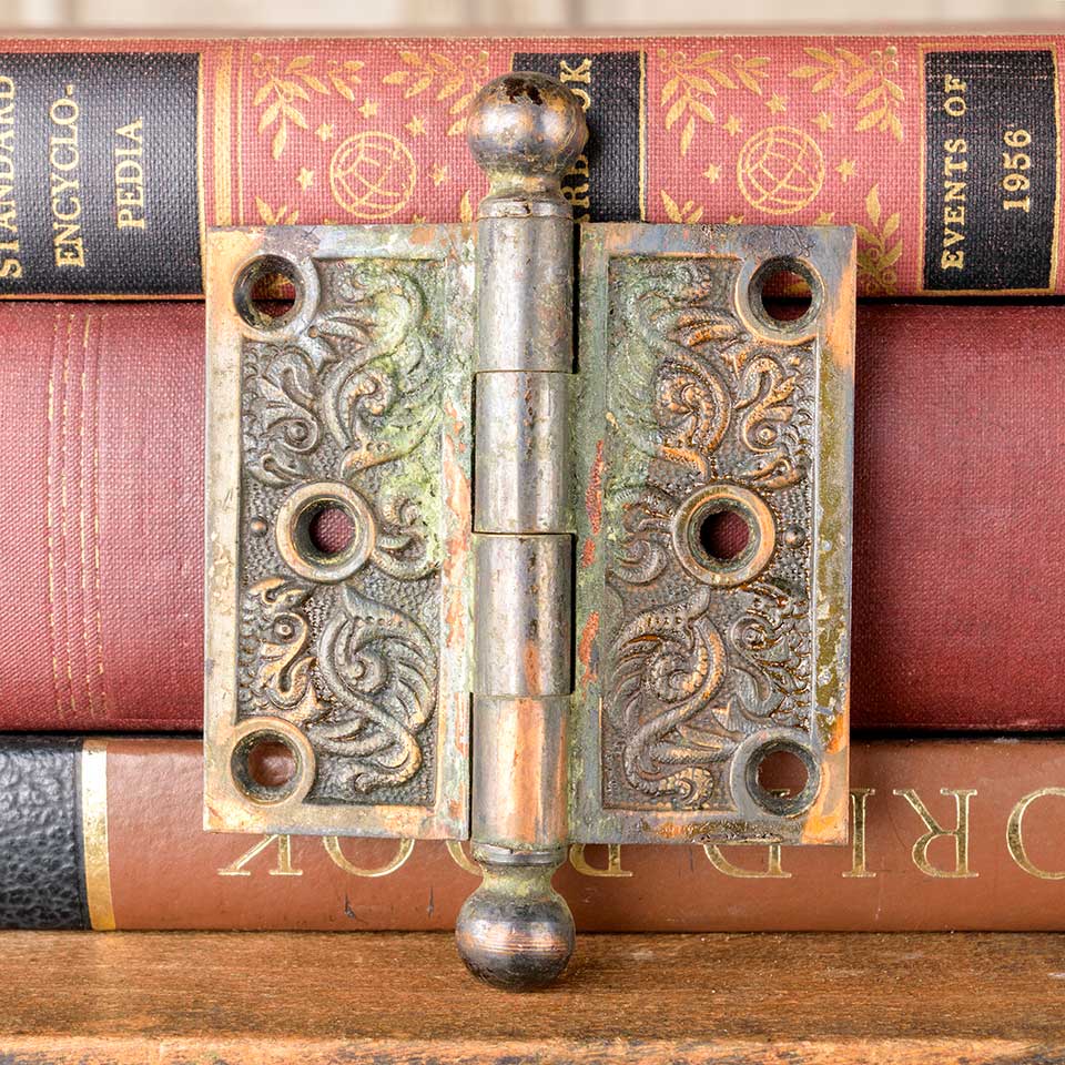 Architectural salvage antique ornate door / furniture butt hinge with ball finials measuring approx. 2 1/2" x 2 1/2" (3 5/8" tall overall including finials). Color and condition may vary.