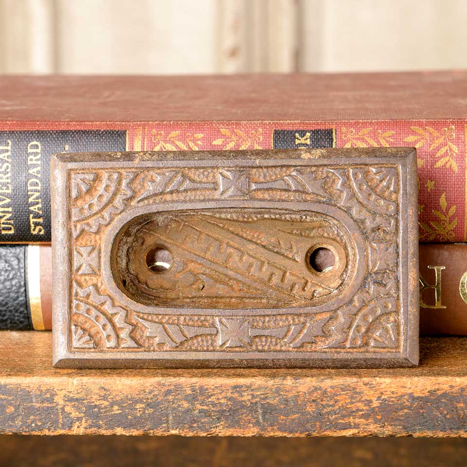 Architectural salvage antique Victorian cast iron window sash lift hardware with Eastlake patterns measuring approx. 3" wide x 1 3/4" tall x 5/8" front to back. The recessed area measures approx. 2 1/8" wide x 7/8" tall. Color and condition may vary.