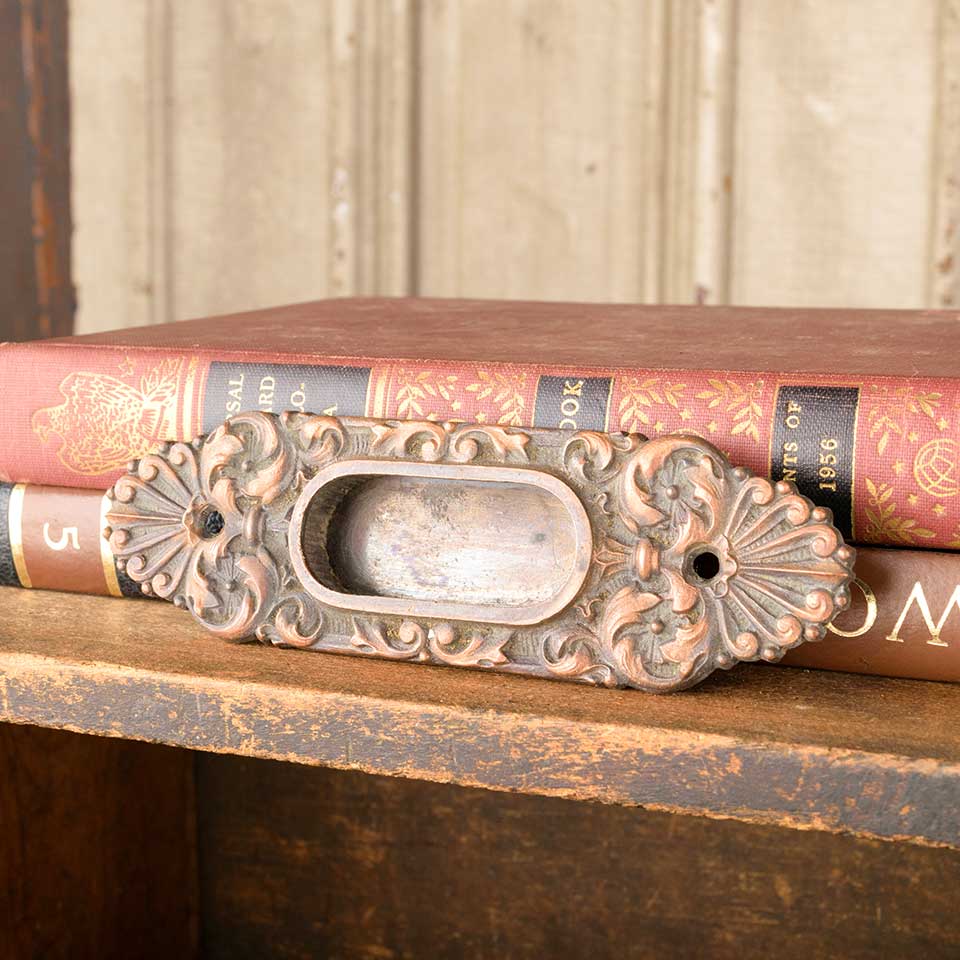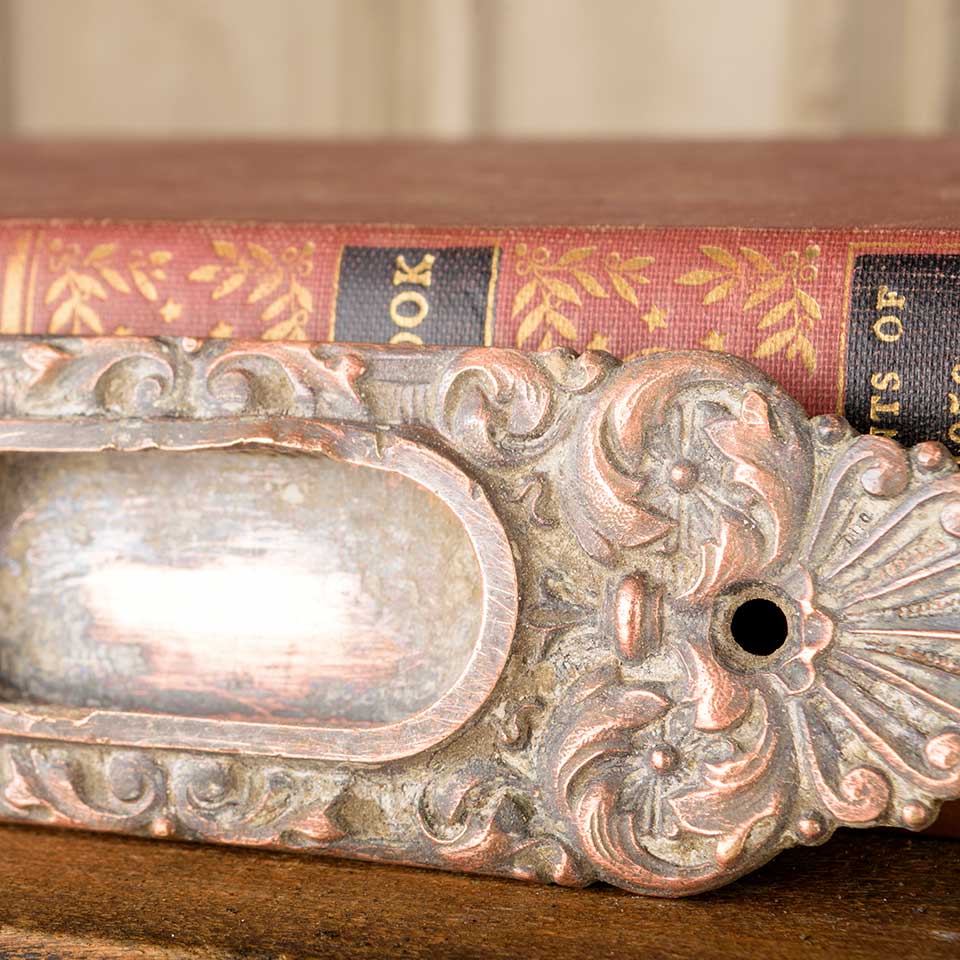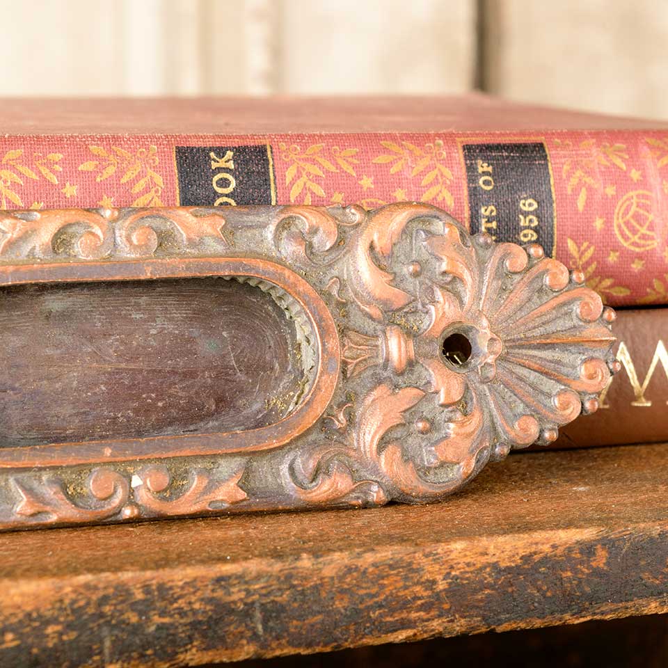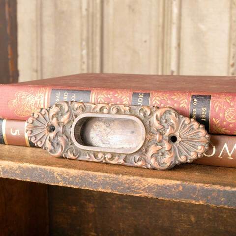 Architectural salvage antique ornate bronze window sash lift hardware measuring approx. 5 1/2" wide x 1 5/8" tall x 1/2" front to back. The recessed area measures approx. 2 1/8" wide x 7/8" tall. Color and condition may vary.