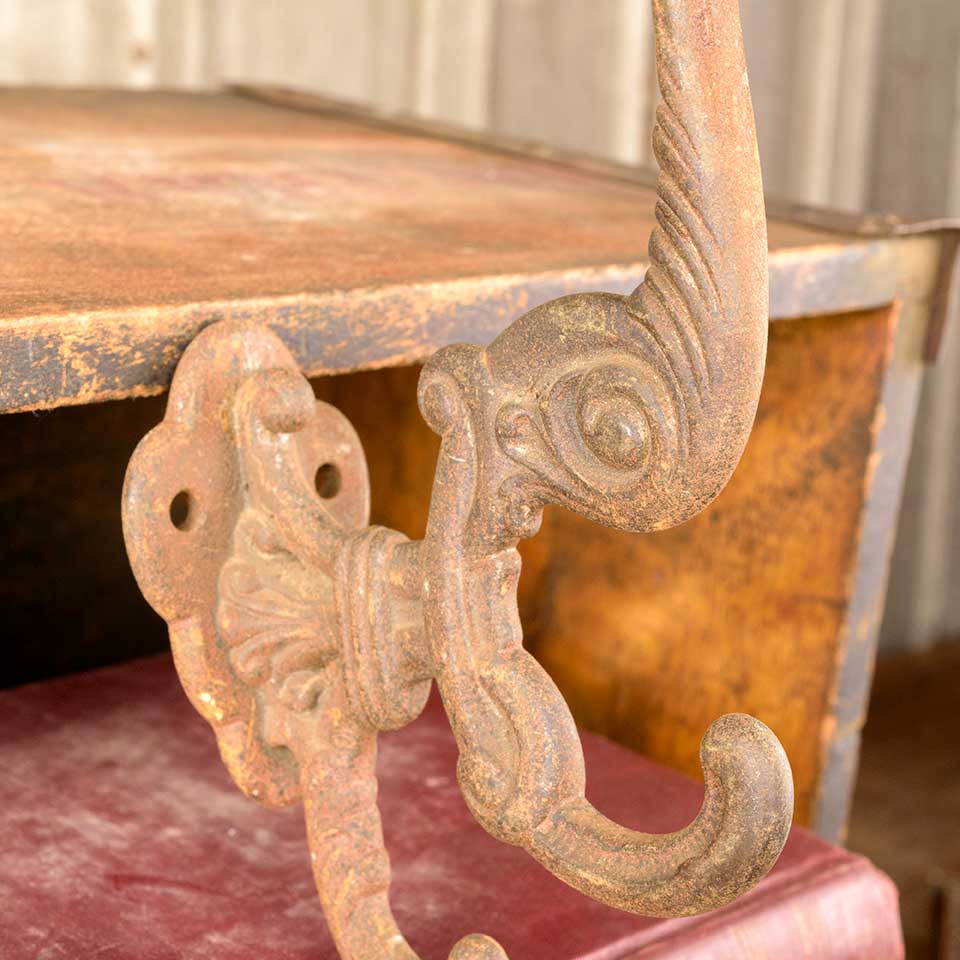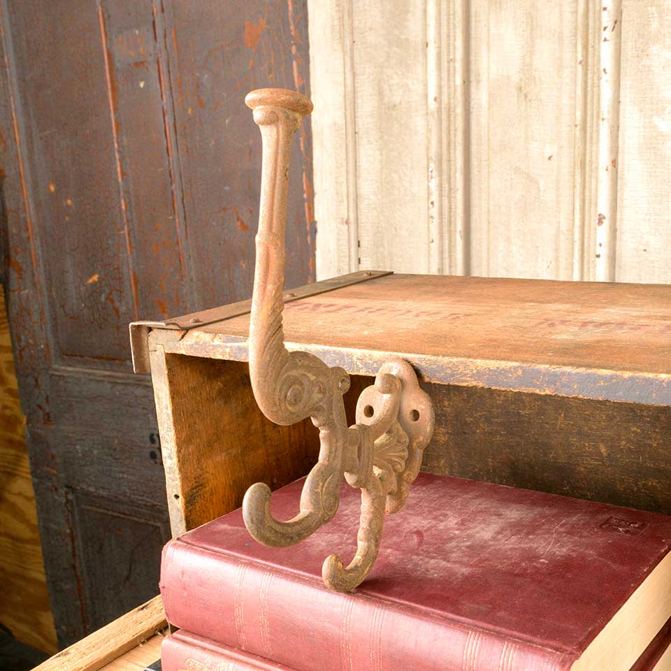 Architectural salvage large ornate antique cast iron hat and coat hook measuring approx. 1 3/4" wide x 7 3/4" tall x 4 " front to back. Color and condition may vary.
