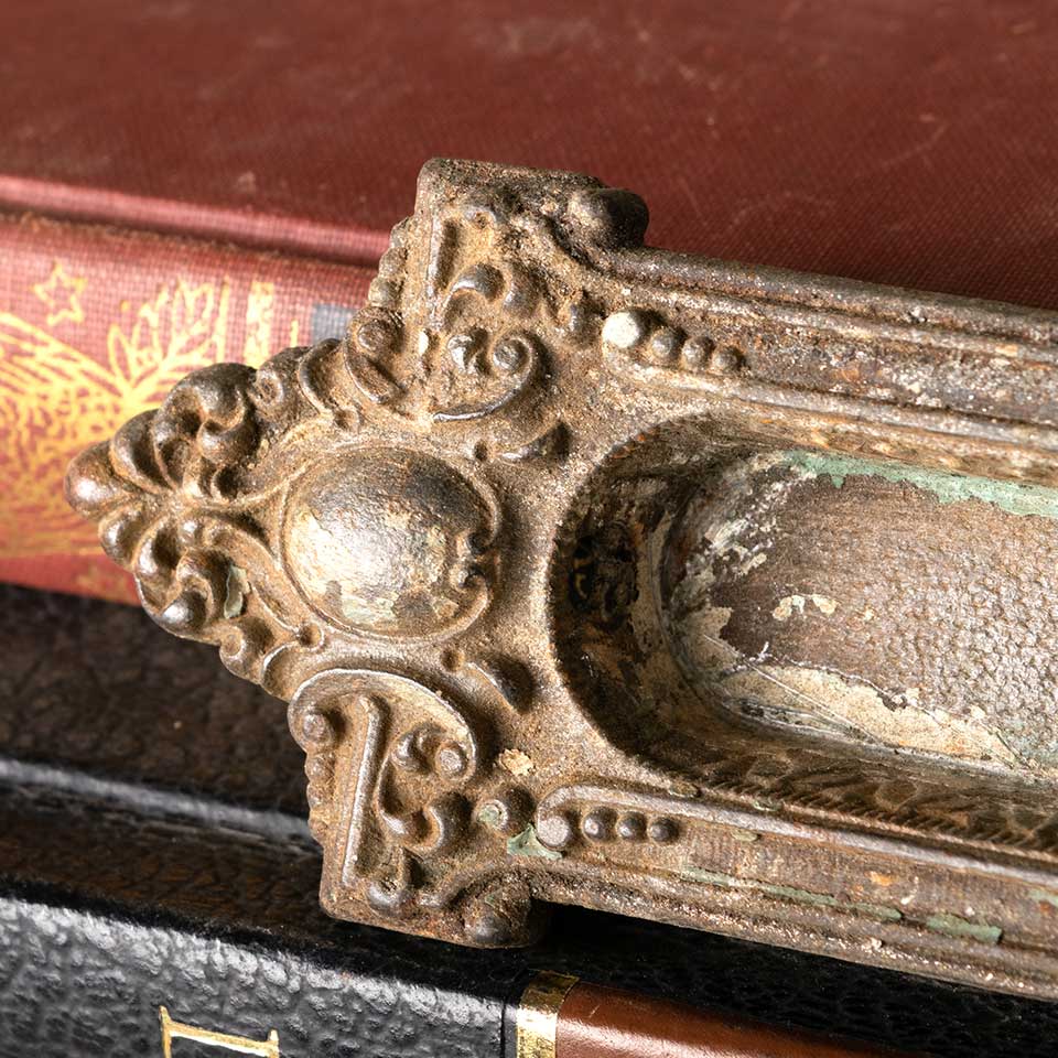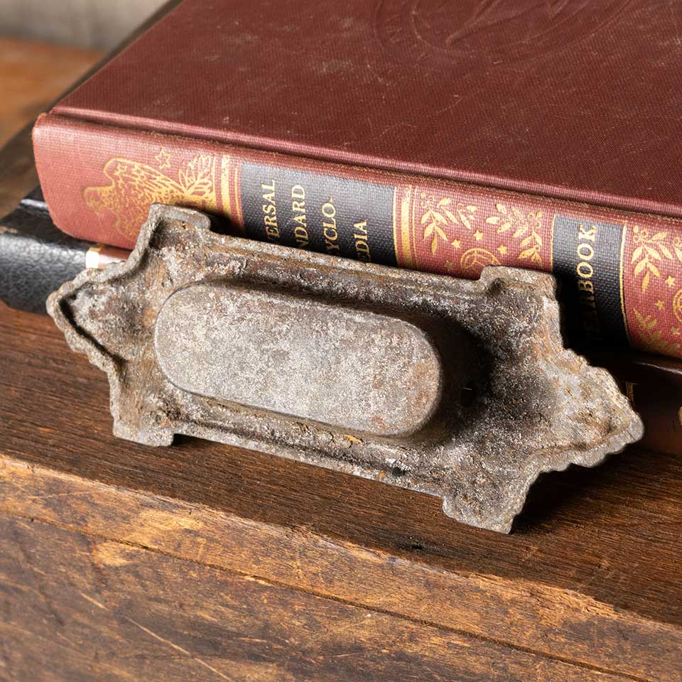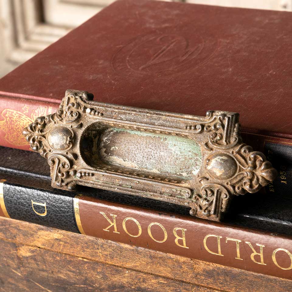 Architectural salvage antique ornate cast iron window sash lift hardware c. early 1900's measuring approx. 5" wide x 1 3/4" tall x 5/8" front to back. Recessed area measures 2 3/8" wide x 7/8" tall. Color and condition may vary.