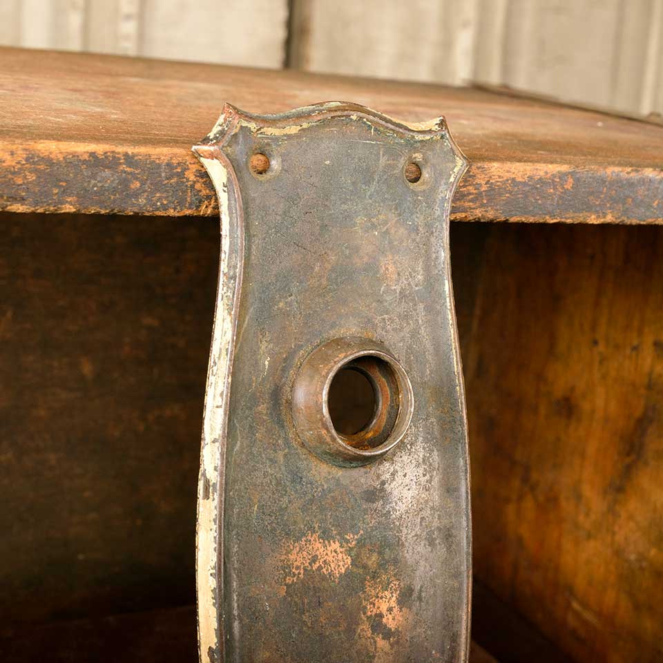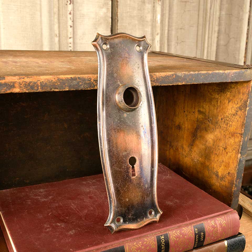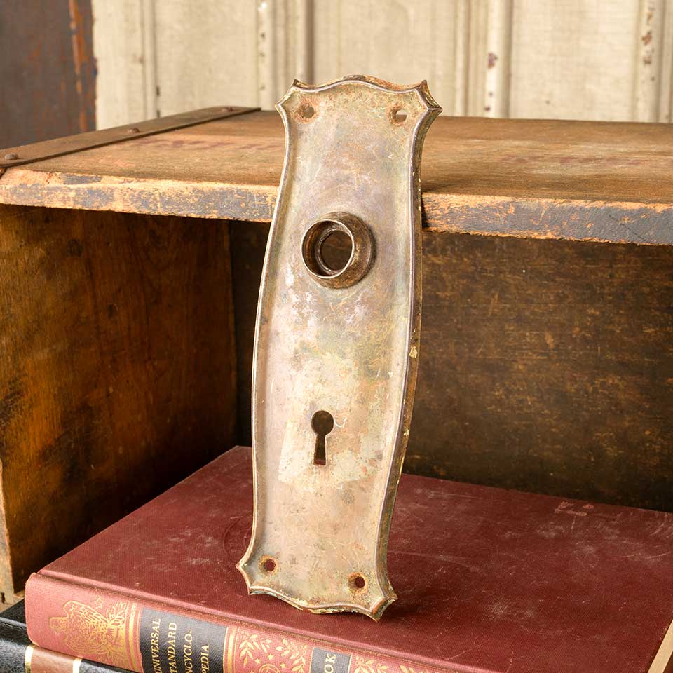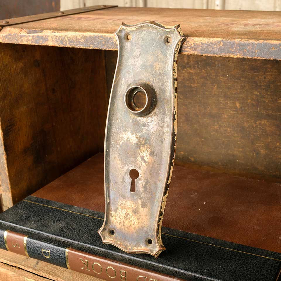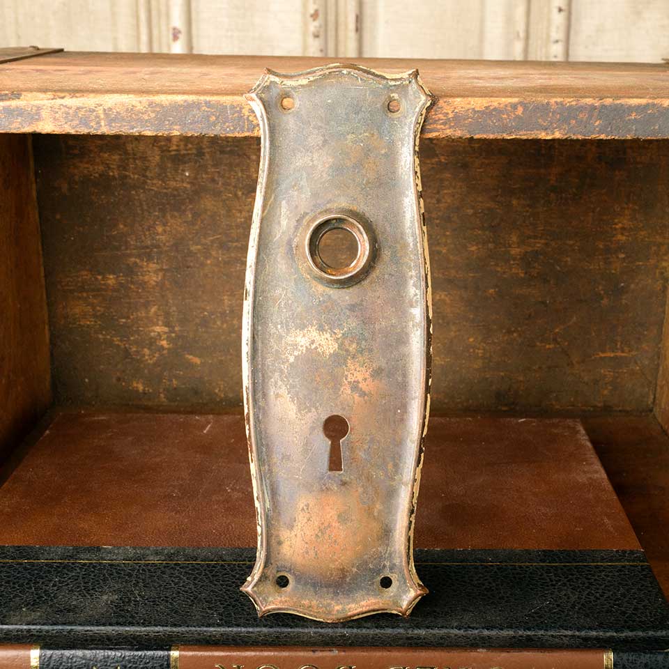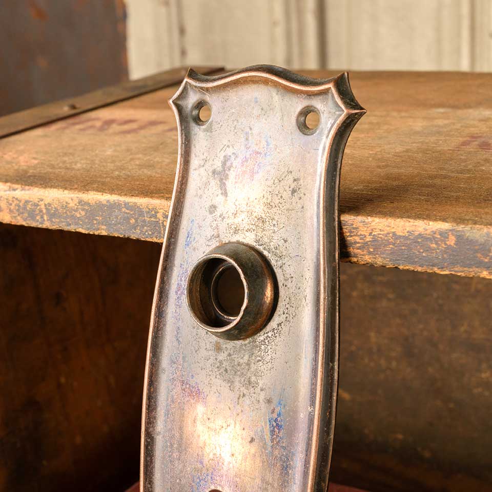 Architectural salvage antique Arts and Crafts pressed metal doorknob backplate door hardware measuring approx. 2 3/8" wide x 7" tall with a 3/4" diameter collar. The spindle and keyhole measure 2 1/2" on centers. Color and condition may vary.
