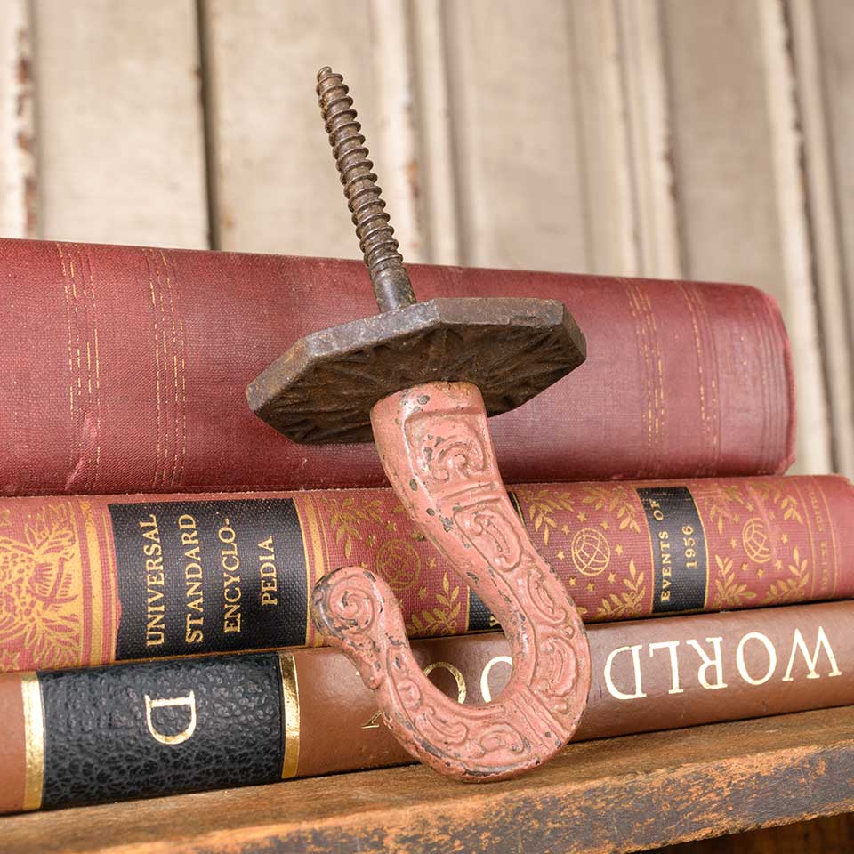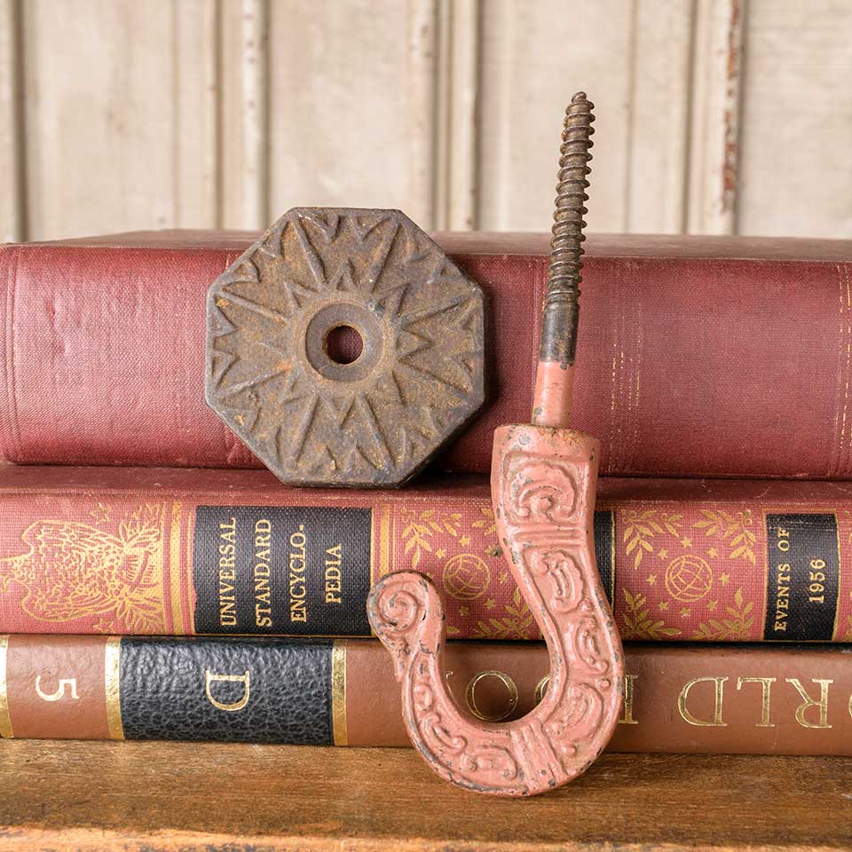 Architectural salvage antique cast iron Victorian Eastlake patterned chandelier ceiling hook with integral wood screw and removable backplate measuring approx. 2 3/8" wide x 5 1/4" tall (hook itself is 2 1/2" tall). See photos to evaluate condition.