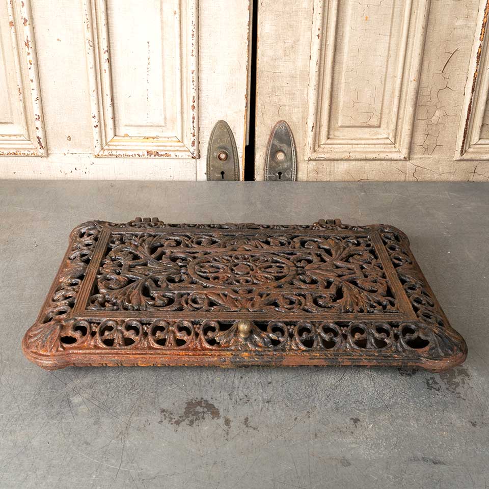 Antique architectural salvage ornate cast iron hinged stove top measuring approx. 25" wide x 3" tall x 16" front to back. See photos to evaluate condition.