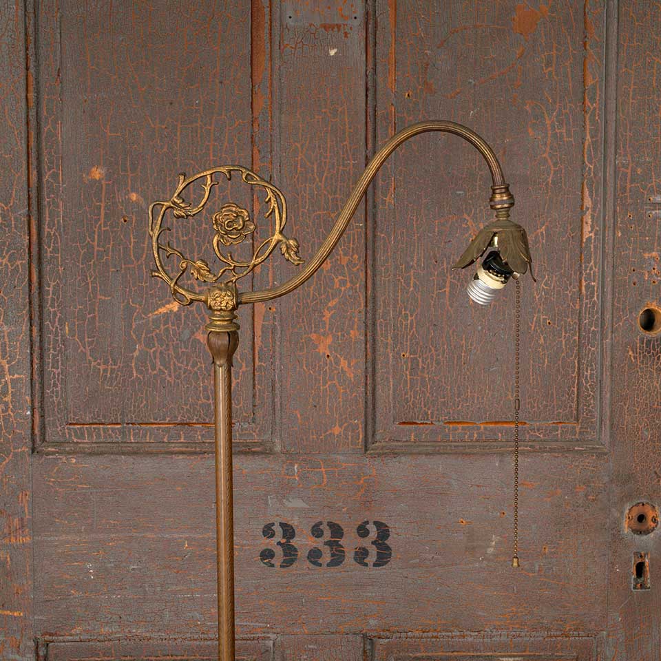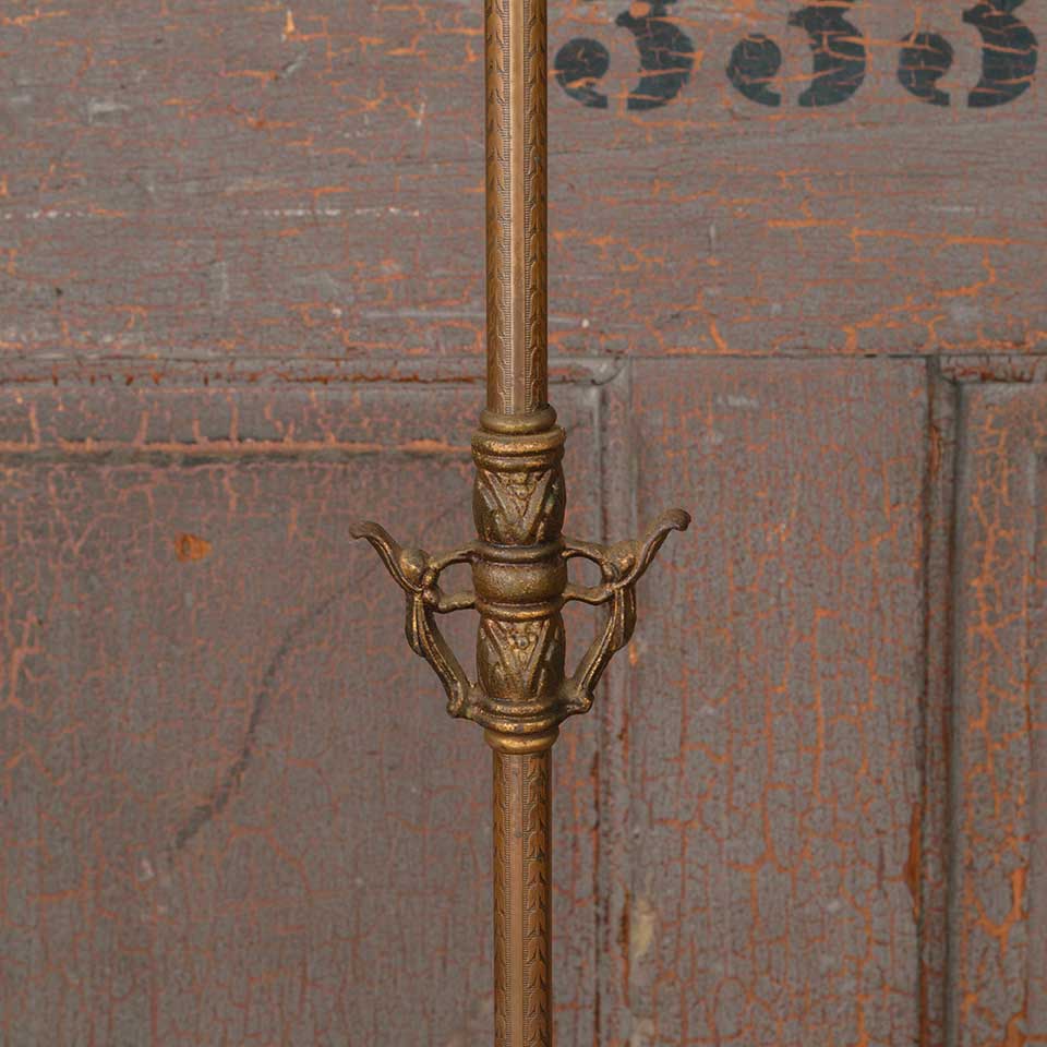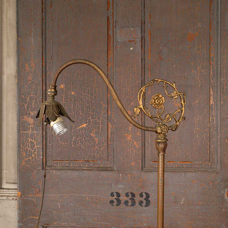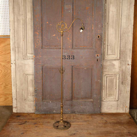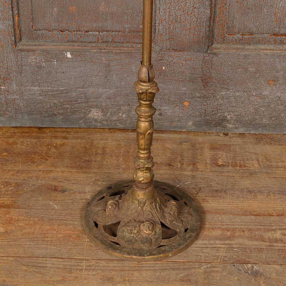 Architectural salvage ornate antique brass floor lamp measuring approx. 56 5/8" tall x 14 1/2" front to back with a 9 1/2" diameter base. This lamp needs to be rewired. See photos to evaluate condition.