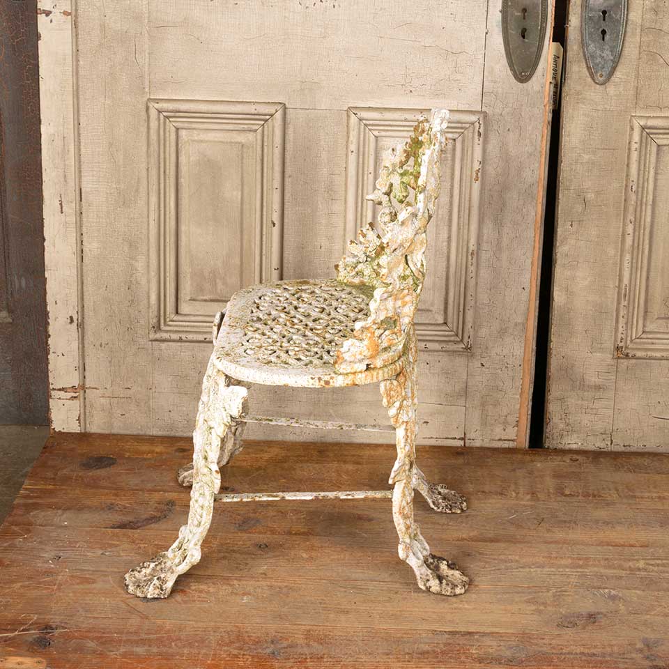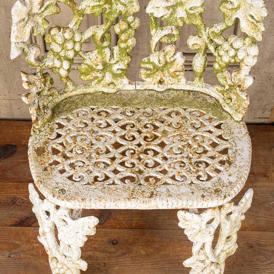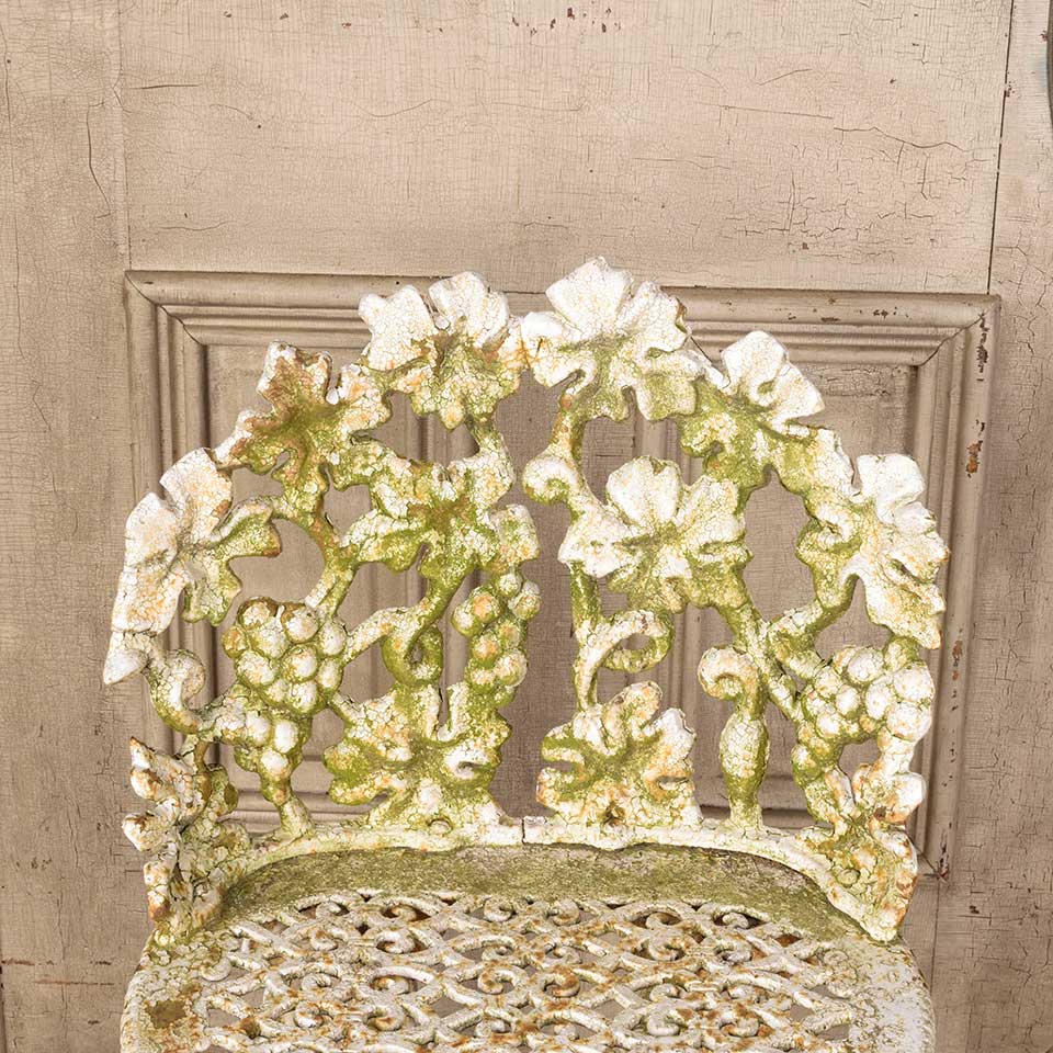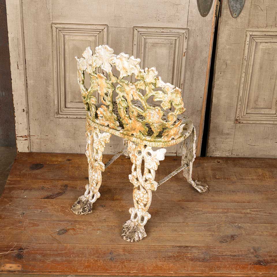 Architectural salvage vintage painted cast iron garden patio chair with grape vine motif measuring approx. 18" wide x 28 3/4" tall x 20 1/2" front to back. There's some paint loss. See photos to evaluate condition.