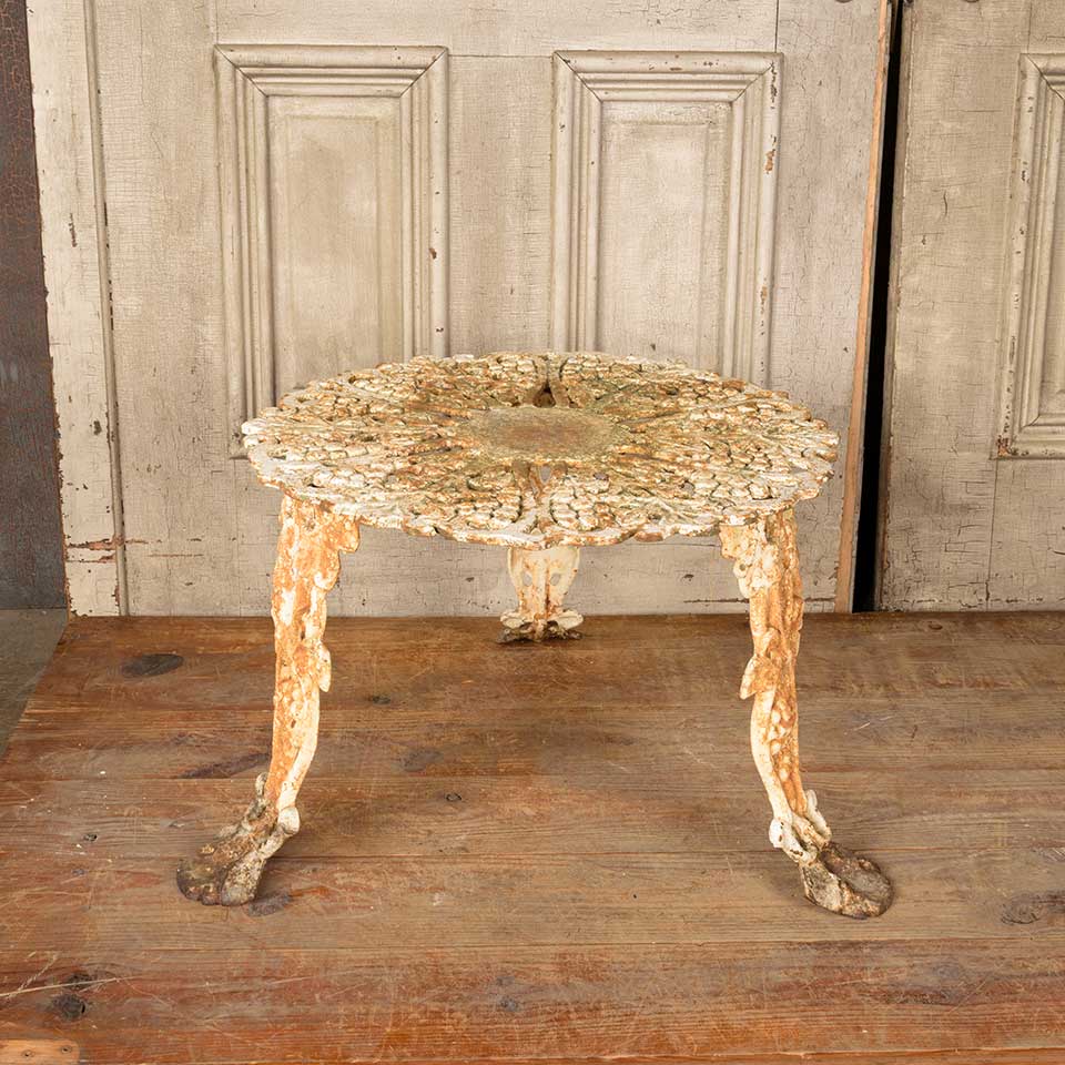 Architectural salvage vintage painted cast iron garden table with grape motif measuring approx. 14 3/8" tall with a 20 1/2" diameter top and a 25" diameter base. See photos to evaluate condition.