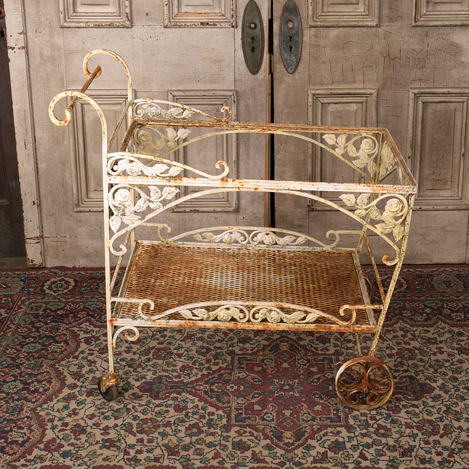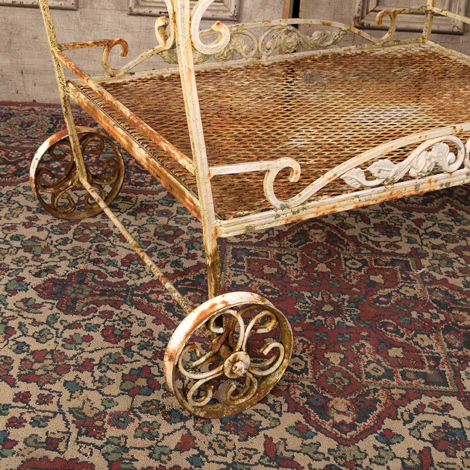 Vintage metal garden tea cart plant stand measuring approx. 23" wide x 35" tall x 36" front to back. See photos to evaluate condition.