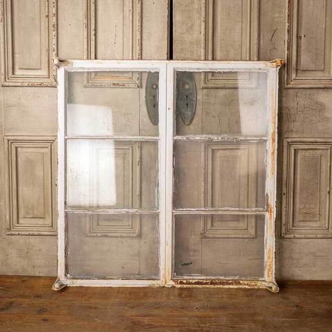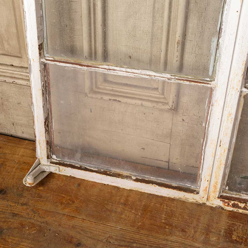 Architectural salvage vintage divided six lite steel casement window measuring approx. 37" wide x 38 3/8" tall x 1 1/4" front to back. One glass pane is cracked. See photos to evaluate condition.