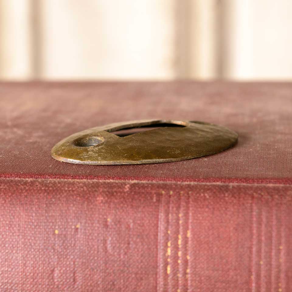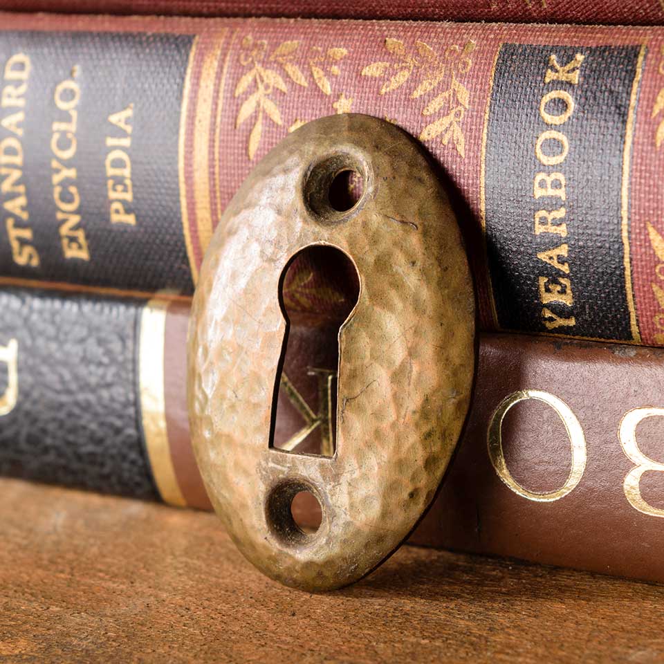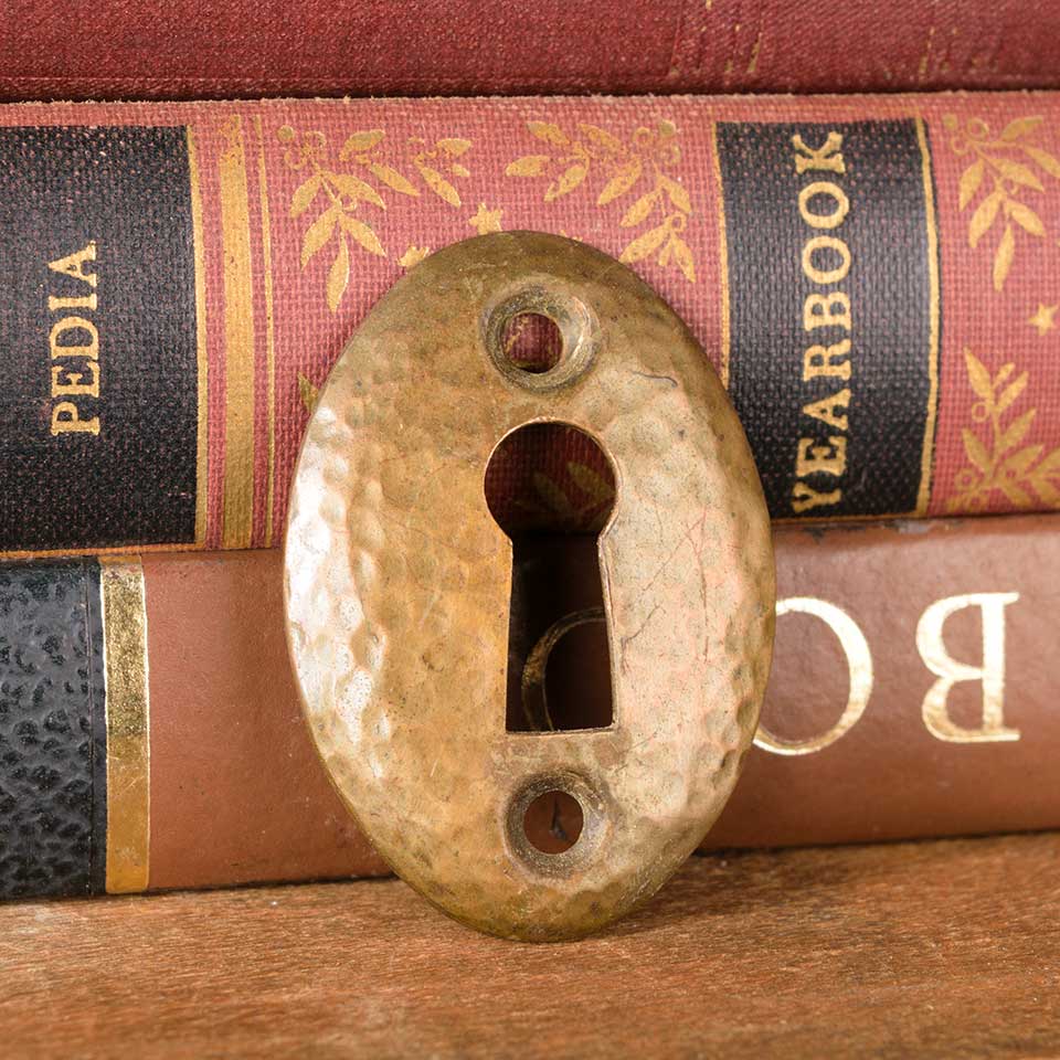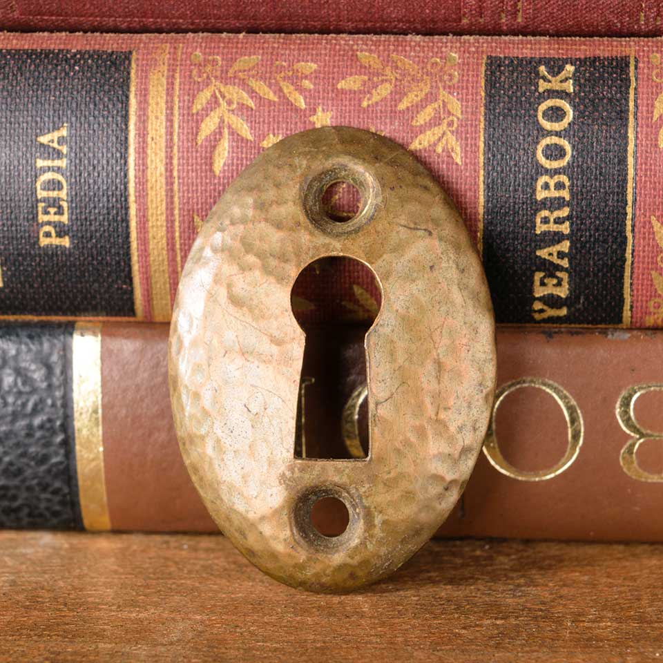 Architectural salvage vintage hammered brass skeleton keyhole escutcheon cover plate door hardware measuring approx. 1 1/4" wide x 1 5/8" tall x 1/8" thick. Color and condition may vary.