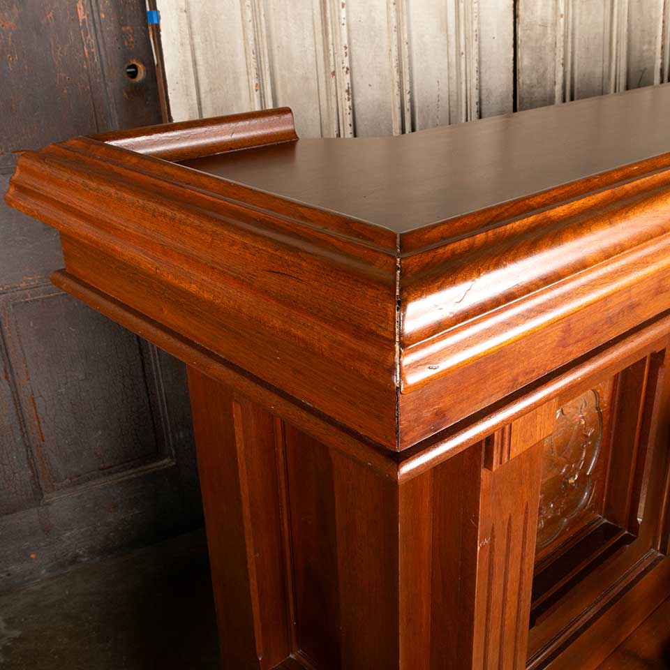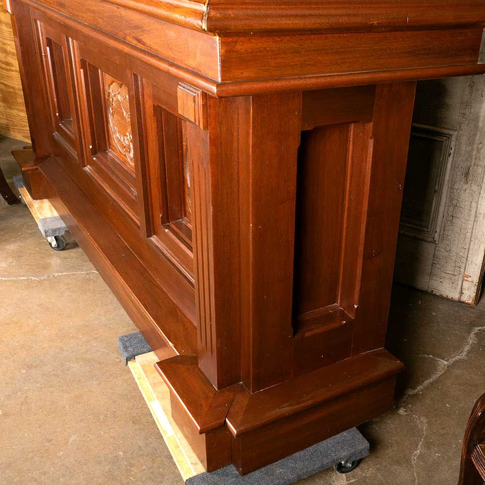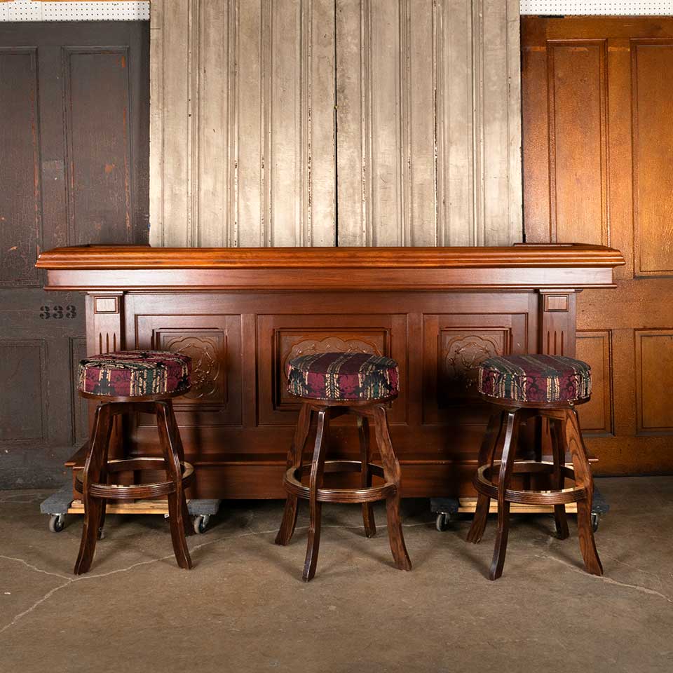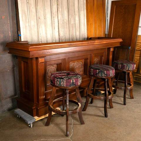 Architectural salvage beautiful dry bar constructed of walnut and antique carved relief panels with bird motif measuring approx. 97 1/4" wide x 43 1/2" tall x 26" front to back. Includes three barstools each measuring approx. 31 3/4" tall with a 17" diameter top. There's some separation of the corners on the bar top. See photos to evaluate condition.