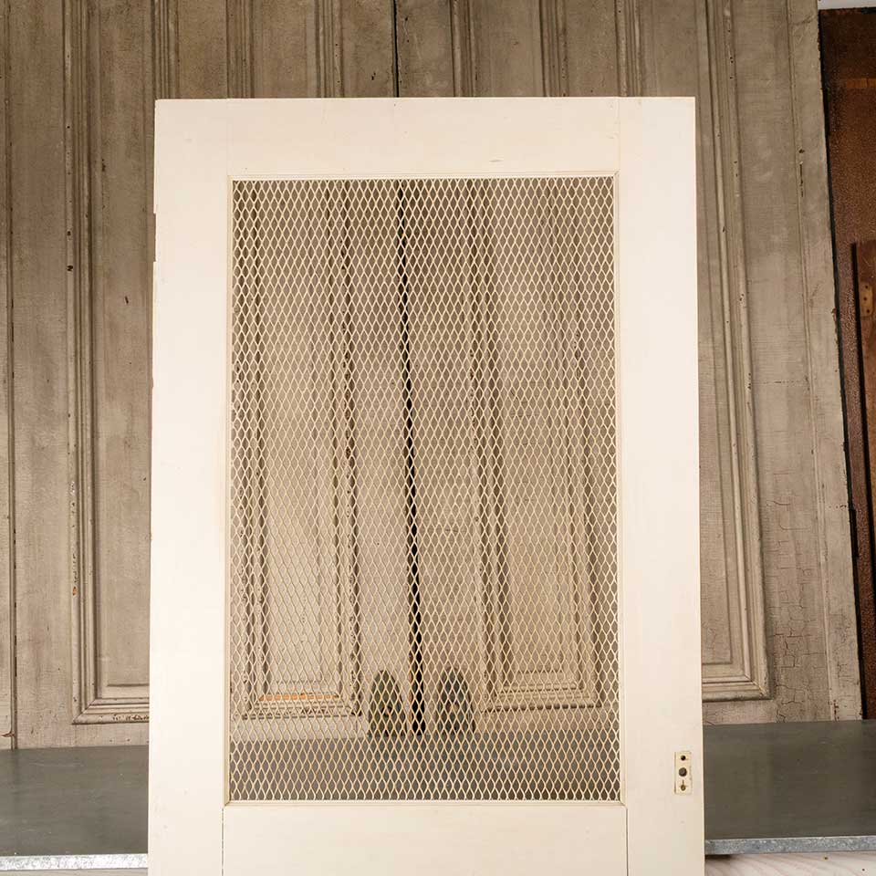 Architectural salvage vintage painted wood door with metal wire screen panel measuring approx. 33 3/4" wide x 79 1/8" tall x 1 1/8" thick. See photos to evaluate condition.