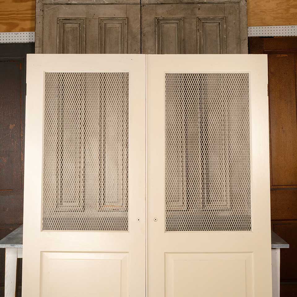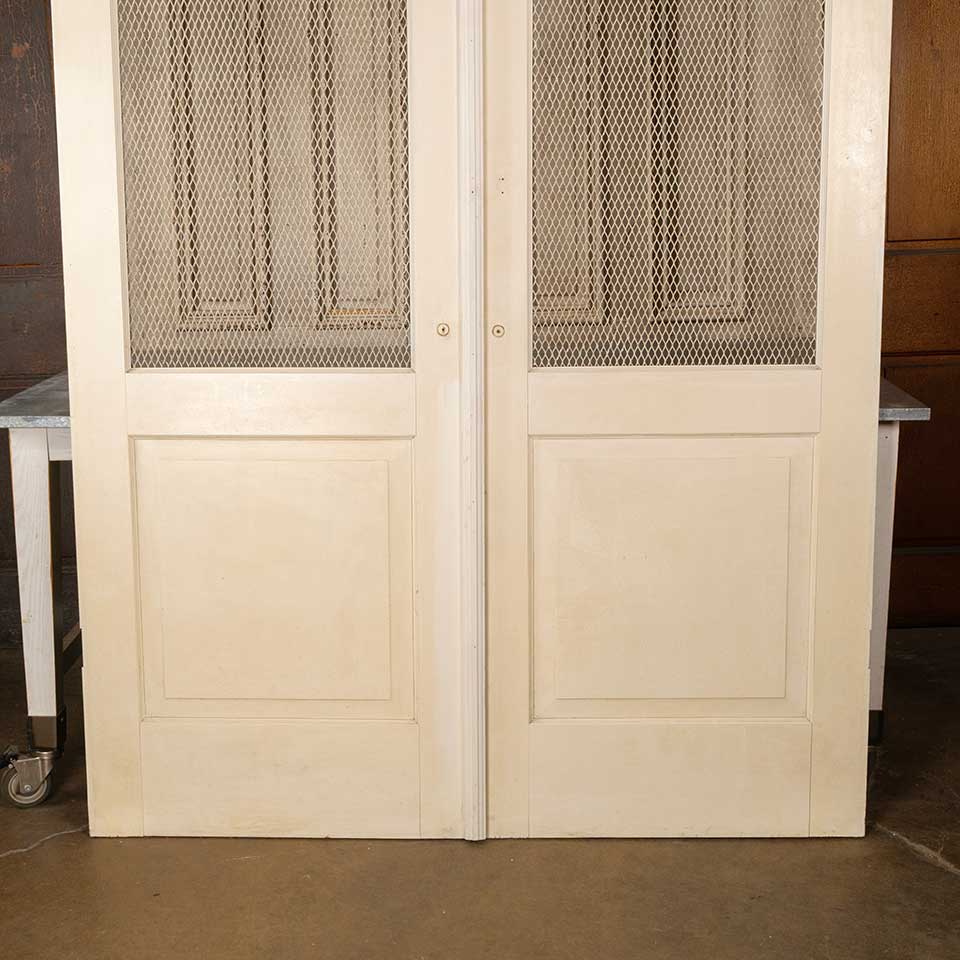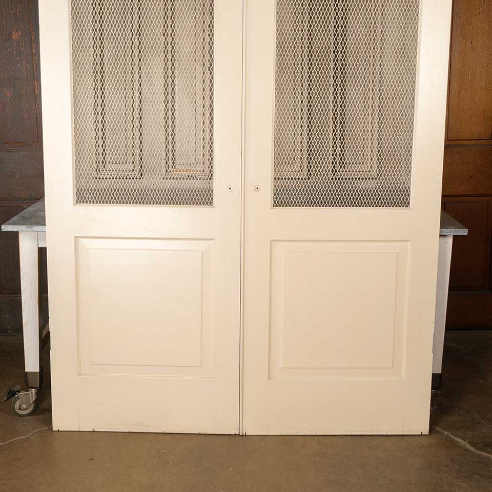 Architectural salvage vintage painted wood screen doors with metal wire screen panels together measuring approx. 60 3/16" wide x 79 7/8" tall x 1 1/16" thick. See photos to evaluate condition. Priced at $595 for the set of two doors.
