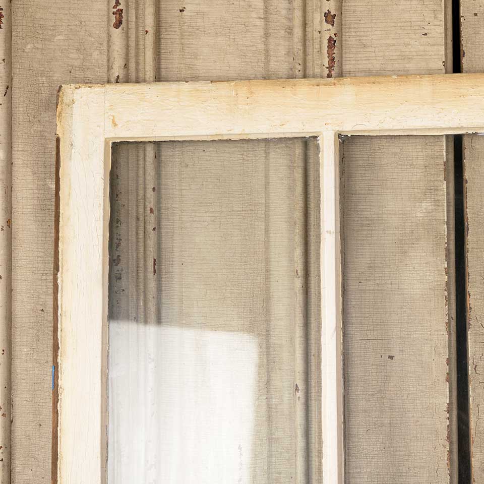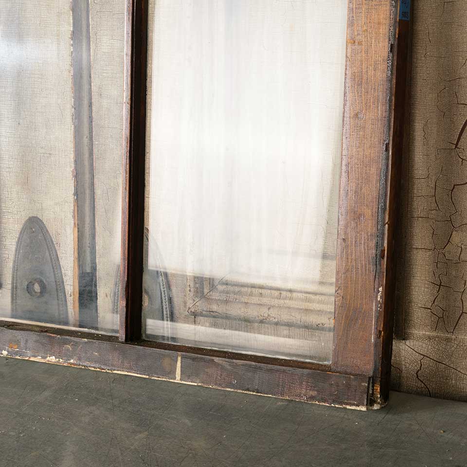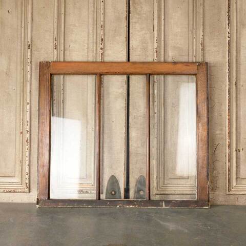 Architectural salvage antique divided three lite wood window sash measuring approx. 32 1/4" wide x 27 3/8" tall x 1 3/8" thick. Color and condition vary.