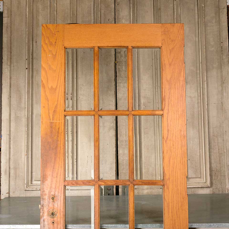 Architectural salvage antique twelve lite French entry door with beveled glass panes and mortise lock measuring approx. 34" wide x 80 1/2" tall x 1 3/4" thick. See photos to evaluate condition.