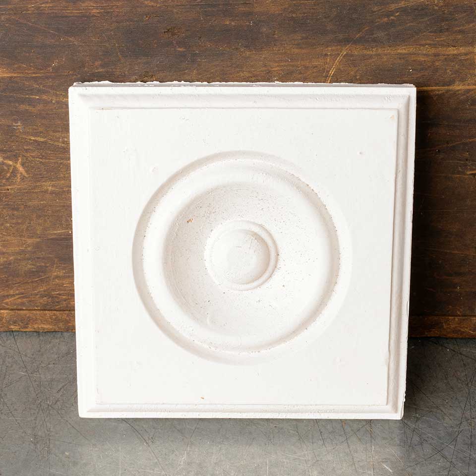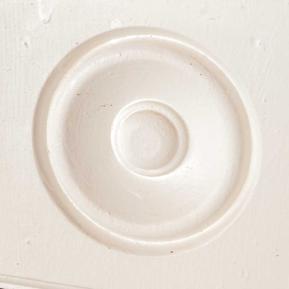 Architectural salvage painted wood rosette interior window or door trim block measuring approx. 5 3/8" 5 3/8" x 1 1/8" front to back. Color and condition may vary.