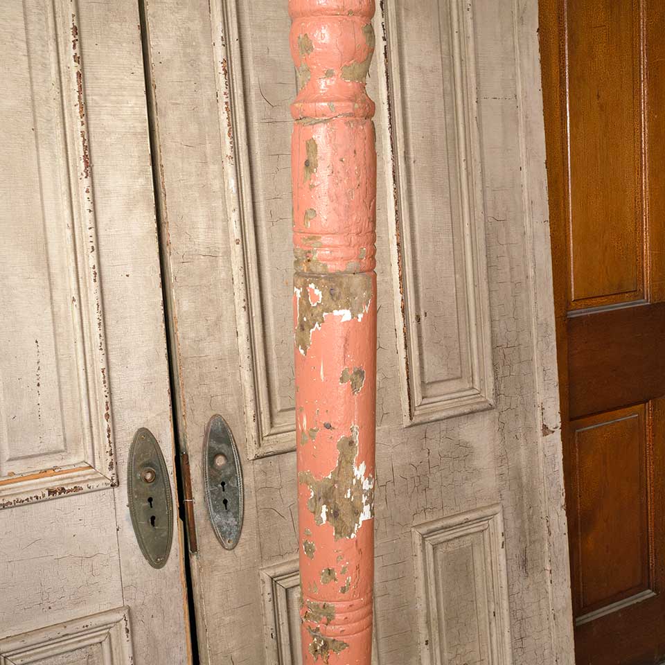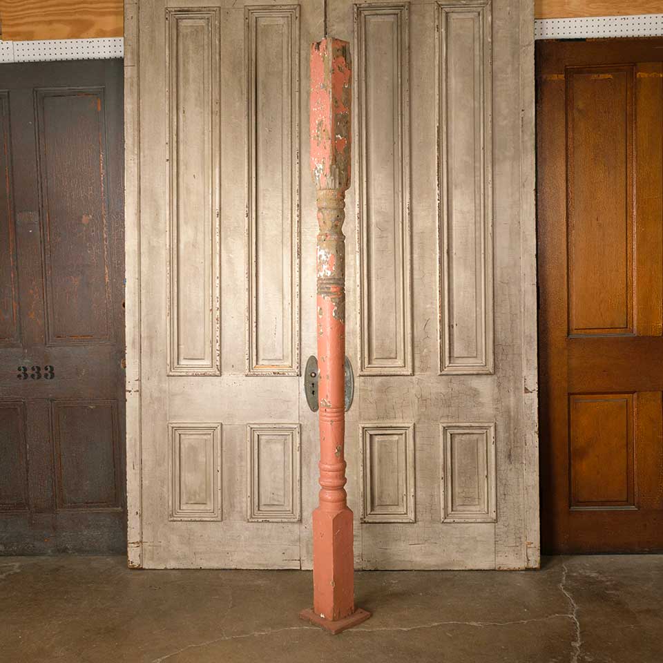 Architectural salvage antique turned wood porch post measuring approx. 4 1/2" x 4 1/2" x 86 3/8" tall with a 7 7/8" x 7 7/8" piece nailed to the bottom. See photos to evaluate condition.