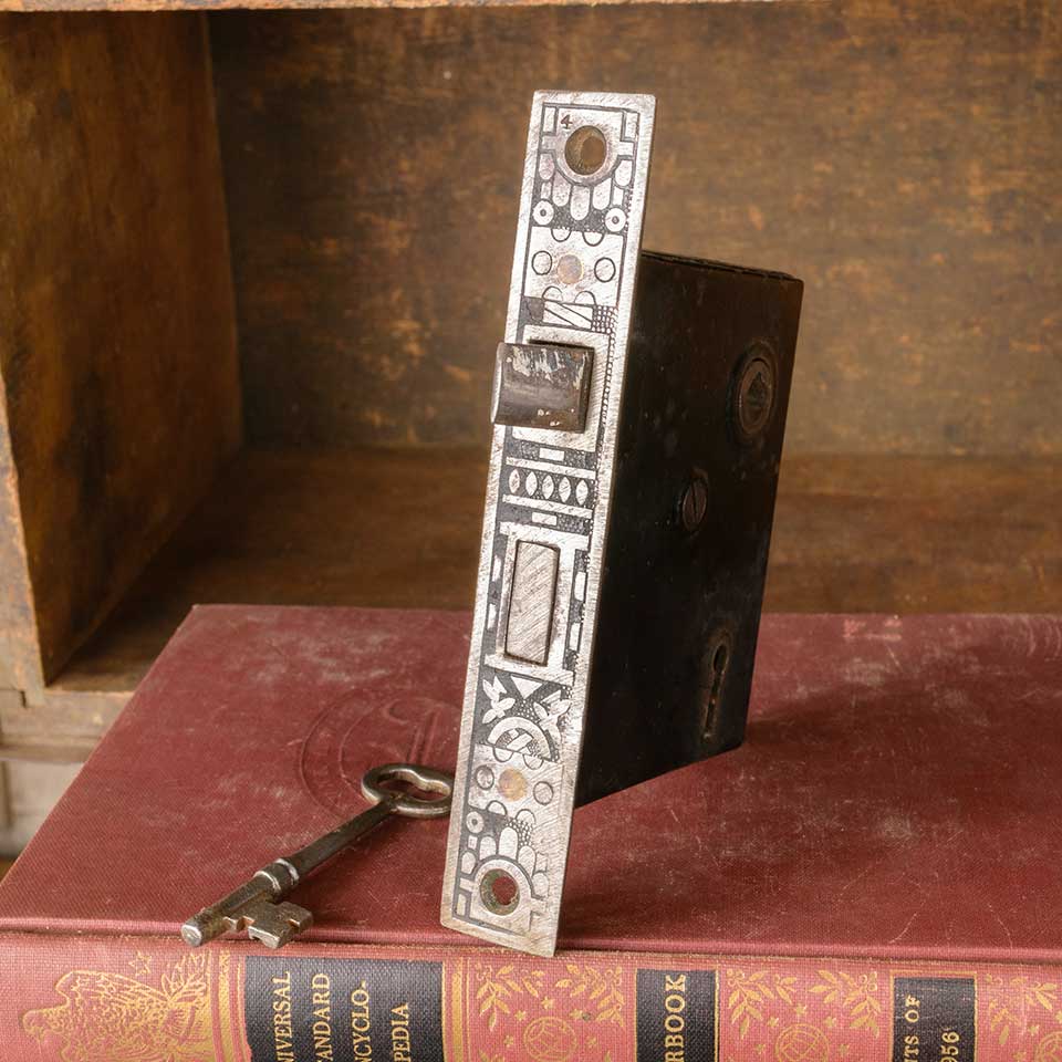 Architectural salvage antique Reading Hardware Co. Windsor pattern (c. 1897) cast iron reversible interior door mortise latch lock hardware set. Measurements: face plate 7/8" wide x 5 1/2" tall x 1/16" thick and body 5/8" wide x 3 3/4" tall x 3 1/8" front to back with a 2 1/2" backset. The distance between the spindle and keyholes is 2 1/2" on center. Skeleton key included. Color and condition may vary. Priced at $55/set.