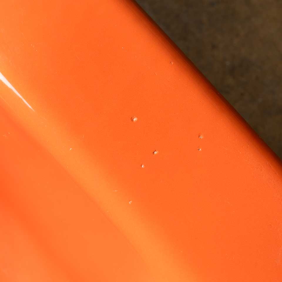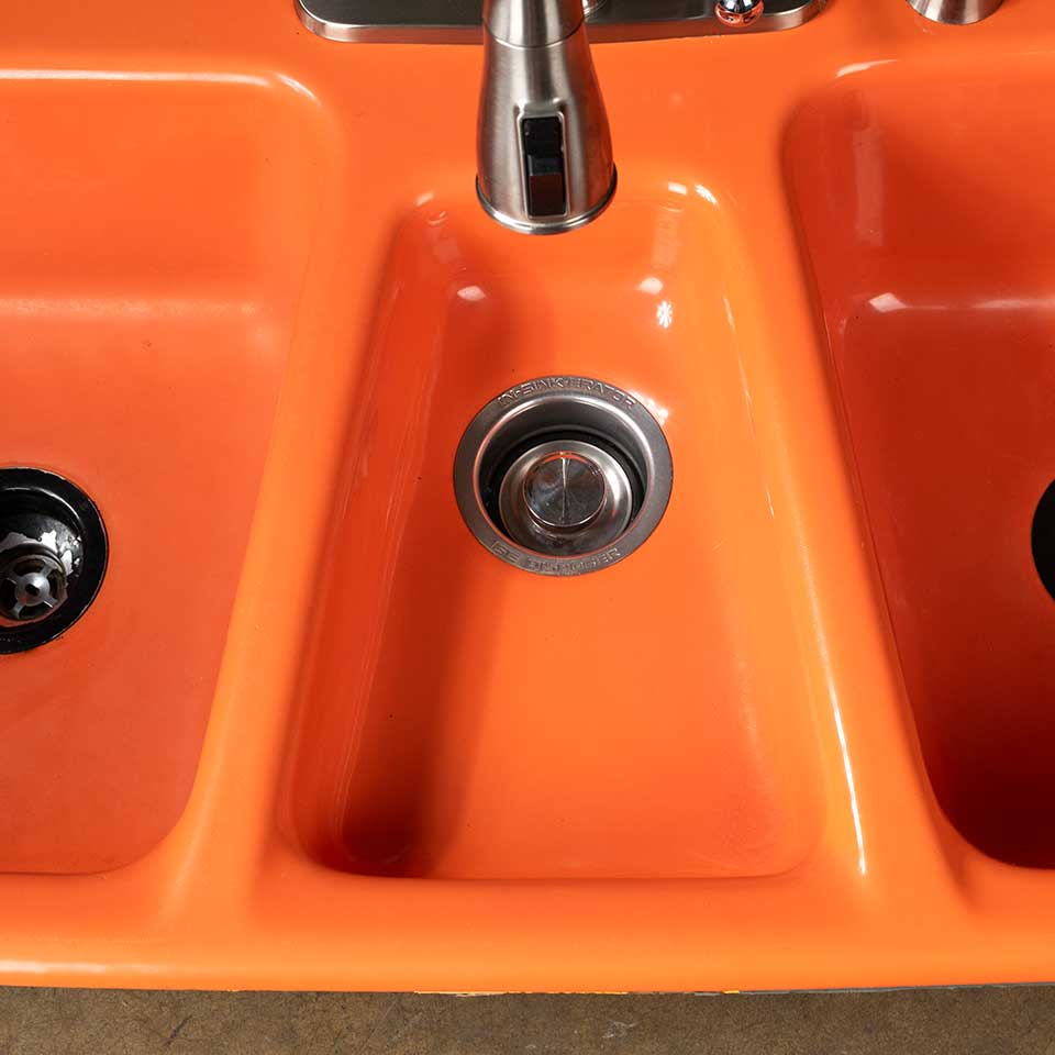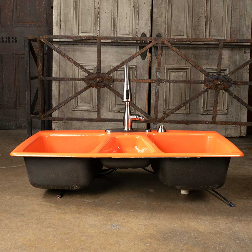 Architectural salvage vintage mid-century modern orange drop-in cast iron kitchen sink measuring approx. 43" wide x 9 1/2" tall x 22 1/4" front to back. Fixtures are included, but not guaranteed to be in working order. See photos to evaluate condition.